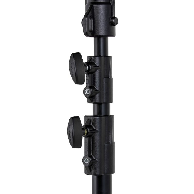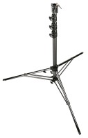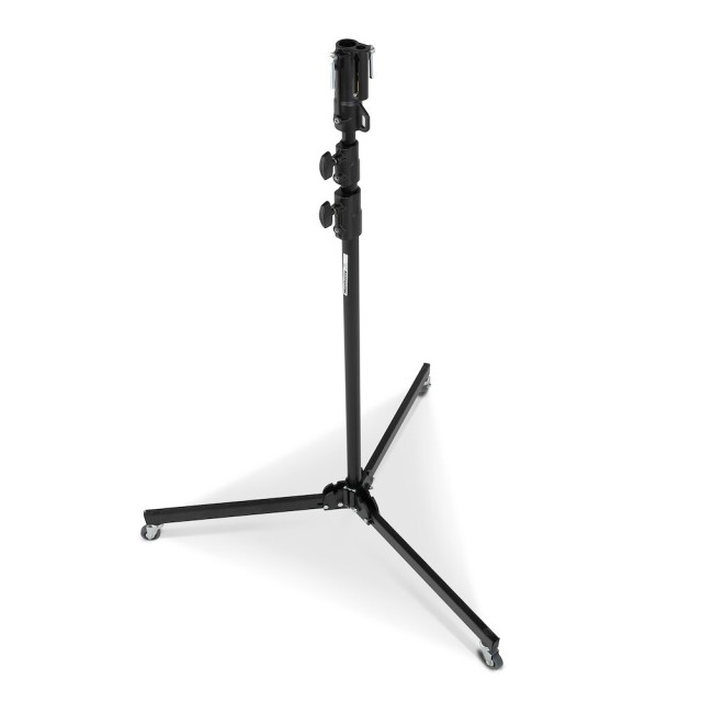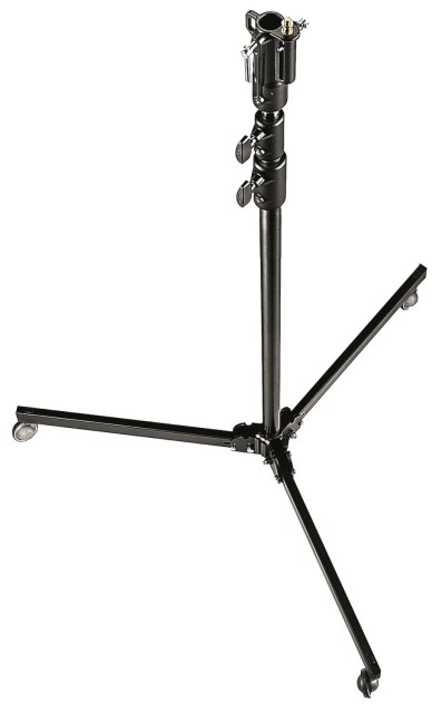 El Manfrotto 298B Black Aluminium 3-Section Studio Stand es un soporte de iluminación profesional de 6 kg con columnas de aluminio anodizado plateado (35/30/25 mm), una base plegable de acero negro con ruedas con freno, una pata de nivelación y una capacidad de carga de 15 kg (5 kg con la extensión máxima de 300 cm); proporciona un soporte estable y móvil para luces de estudio medianas, softboxes o rigs aéreos.