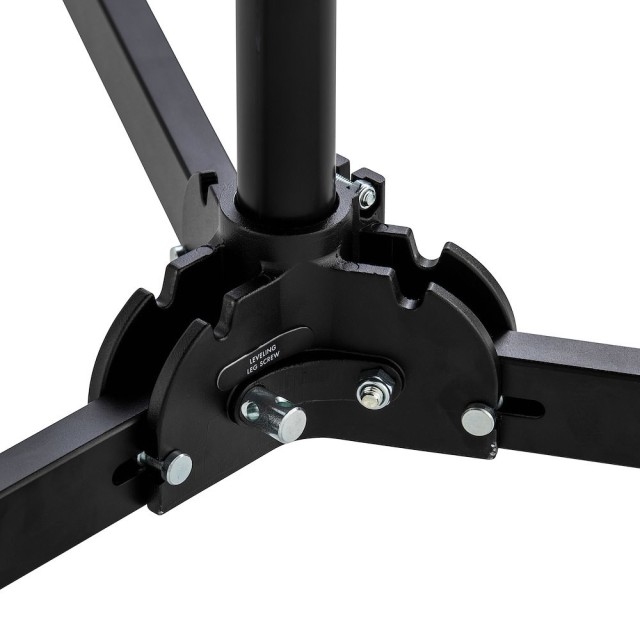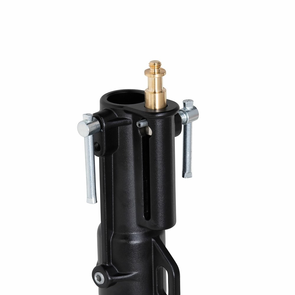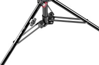 El Manfrotto 298B combina una amplia base de acero negro tipo araña (con tres ruedas bloqueables y una pata niveladora ajustable) y tres secciones de aluminio plateado que, gracias a dos extensiones de altura, se pueden extender de forma continua hasta 300 cm. Las patas rectangulares de acero se pliegan hasta quedar planas para su transporte, mientras que la pata niveladora compensa las irregularidades del suelo hasta ±15°. Complementado con un «baby stud» extraíble de 5/8" (16 mm) y una rosca de 3/8"-16 (reducción de 1/4"-20 disponible), es ideal para estudios de retratos, estudios de vídeo o empresas de alquiler que necesitan un soporte estable con ruedas capaz de soportar 15 kg a baja altura o 5 kg a la altura máxima: resistencia fiable para el uso profesional diario.