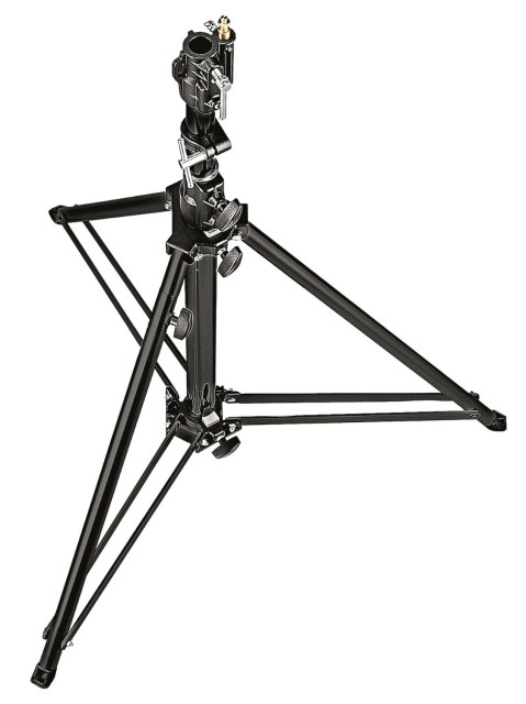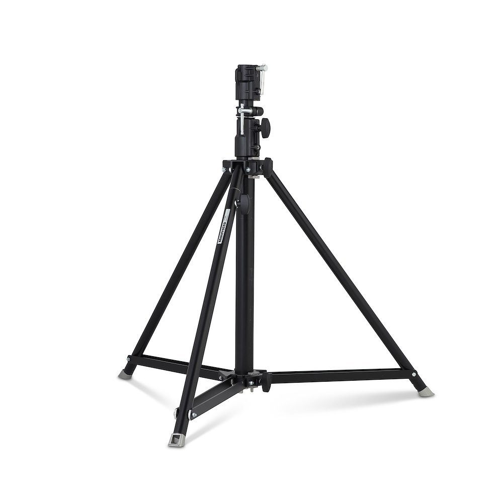 El trípode Manfrotto 070BU cuenta con un bastidor de aluminio anodizado negro que pesa 6,2 kg. Dos puntales neumáticos se extienden hasta una altura máxima de 147 cm mediante cierres suaves, mientras que las patas dobles de acero cromado y la amplia base de 120 cm de ancho garantizan una flexibilidad nula con cargas de hasta 35 kg. El cabezal universal tipo 14 está equipado con una rosca de 28 mm y un pasador de 16 mm con pestillo de seguridad, compatible con todos los elementos de fijación estándar. Una pata niveladora se ajusta en un rango de ±15° para compensar la inclinación, y la baja altura mínima de 88 cm garantiza que los operadores no tengan ninguna limitación. Con una altura plegada de 105 cm, es el soporte ideal para teatros, actuaciones en directo o estudios de cine, donde la altura, la estabilidad y el traslado rápido son imprescindibles.