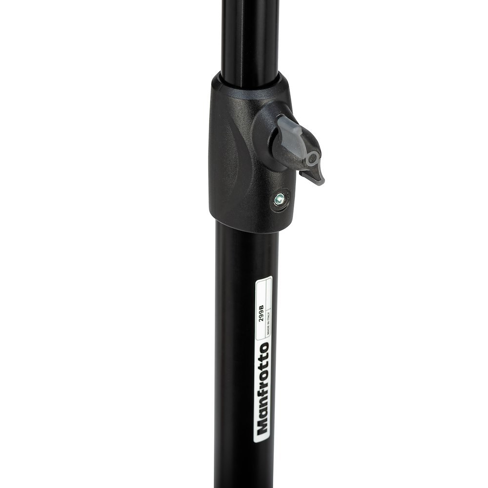 El Manfrotto 299B combina una base de araña de acero negro de gran resistencia con tres secciones de aluminio ligeras y dos extensiones de altura. Las patas rectangulares proporcionan una excelente estabilidad lateral, la pata niveladora compensa las irregularidades del suelo y el freno de rueda de 80 mm de alta calidad permite desplazarse con suavidad sin necesidad de levantarlo. La parte superior está equipada con un casquillo de 17,5 mm y roscas de 3/8″ y 1/4″; además, el paquete suele incluir el clásico adaptador Manfrotto Art. 013 Baby-to-Junior. Con un peso de 4,8 kg, es fácil de transportar, pero bajo carga real en el estudio es firme como una roca.