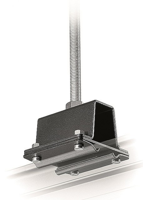El FF3214A es un soporte de techo básico para instalaciones permanentes de Sky Track, ideal si utilizas tu propia barra roscada o si deseas atornillarlo directamente a la viga del techo. El soporte cuenta con una gran placa base con un orificio roscado central en el que se puede insertar una barra o un tornillo de hasta ½″ (M12–M13) de diámetro, y un pasador integrado para fijar el riel en la parte inferior. Al fijar el soporte entre dos tuercas en la barra, una vez colgado todo el riel, puede ajustar con precisión la altura y la nivelación del riel con una precisión de fracciones de milímetro, lo cual es esencial para un movimiento perfectamente fluido del pantógrafo y del carro.