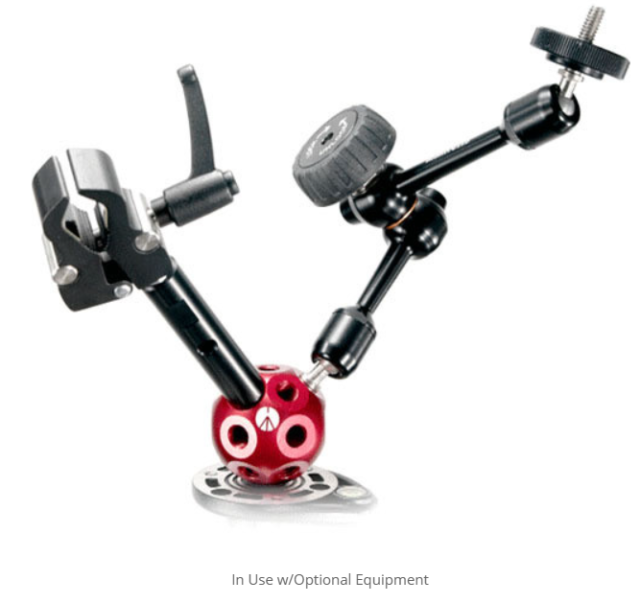 El kit Manfrotto Dado permite crear un nodo de múltiples brazos de 360° a partir de un solo trípode o una superpinza. La esfera roja de aluminio cuenta con seis ranuras de 3/8"-16 dispuestas en un patrón geométrico preciso, en las que se pueden insertar seis varillas negras de 3" (7,6 cm), cada una con una rosca de 3/8"-16 en ambos extremos. Añade más varillas Dado, brazos Magic Arms o pivotes y monta LED, micrófonos de solapa, gobos o reflectores en cualquier orientación.