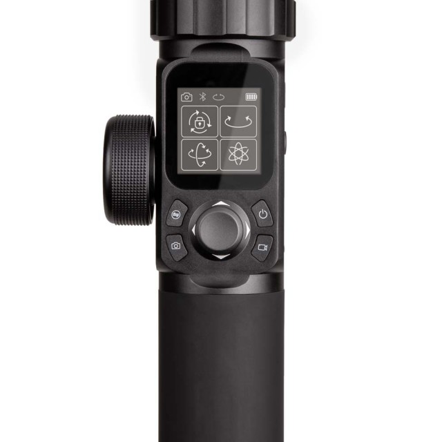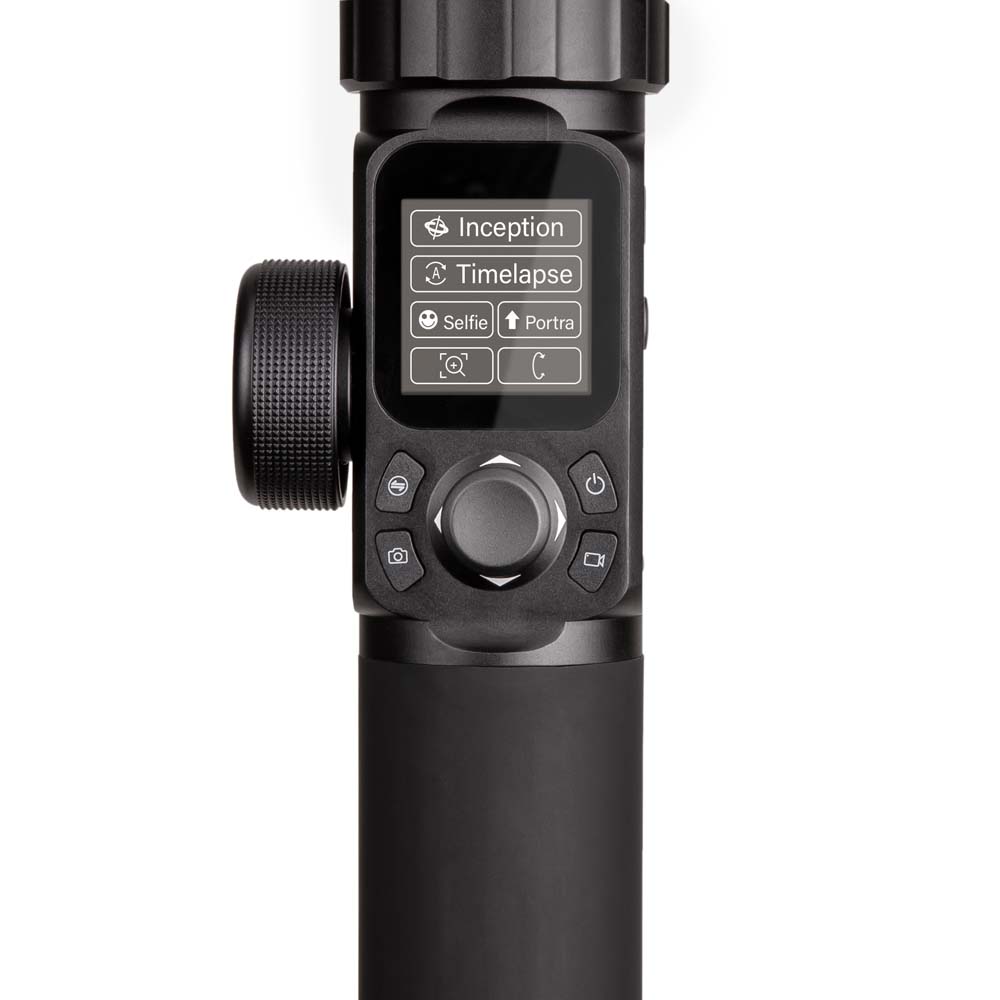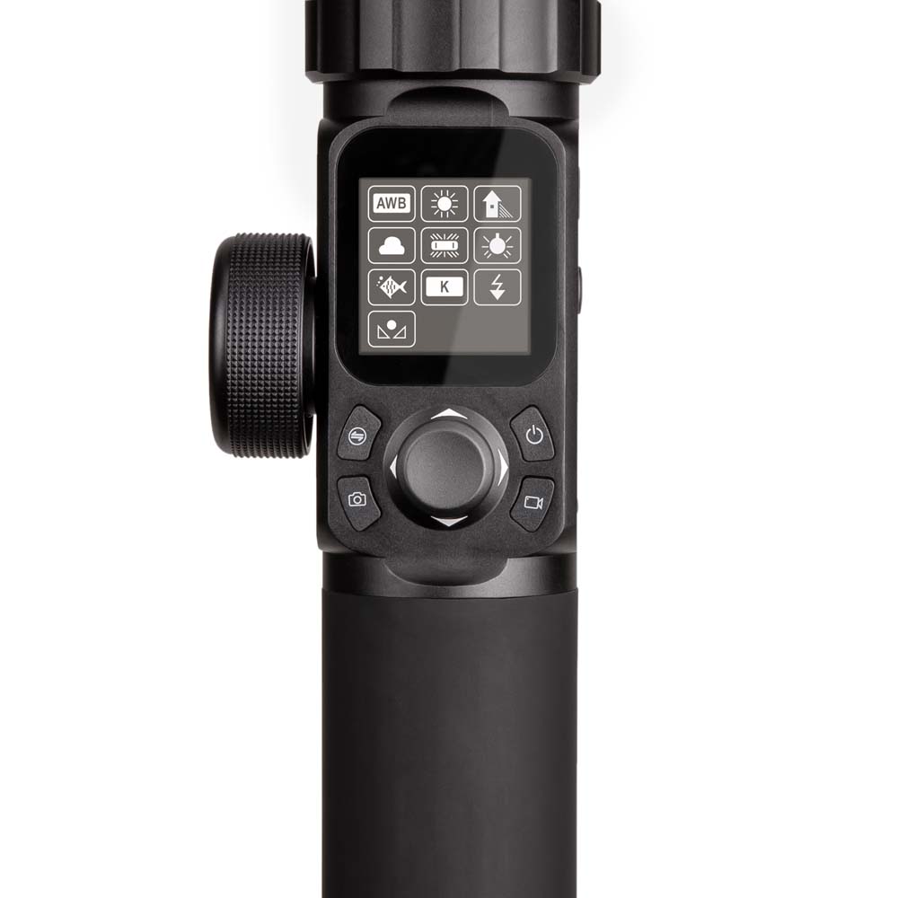 El gimbal está equipado con una pantalla LCD táctil que permite cambiar fácilmente de modo de funcionamiento y controlar el giro y otras funciones con una sola mano. Entre las funciones de control se incluyen la captura de fotos y vídeos, el enfoque, el zoom, la sensibilidad, el balance de blancos y el ajuste de los valores de exposición.