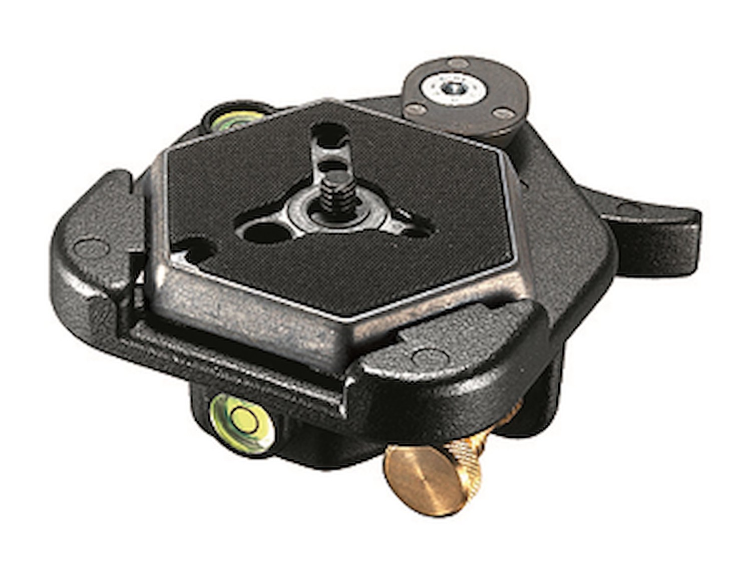 Adaptador hexagonal universal para placas de fijación rápida Manfrotto 625 con doble rosca de 1/4" y 3/8", equipado con niveles de burbuja integrados para una alineación precisa.La placa hexagonal 030 incluida ofrece mayor comodidad y estabilidad para una fijación y liberación rápidas.