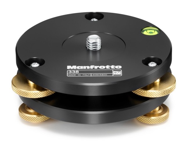 La base de nivelación Manfrotto 338 permite nivelar con precisión la cámara en trípodes que no cuentan con mecanismos de nivelación integrados. Está equipada con tres ruedas de ajuste, anillos de bloqueo y un nivel de burbuja integrado.