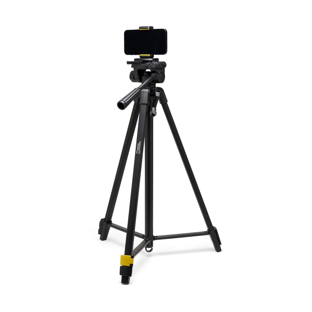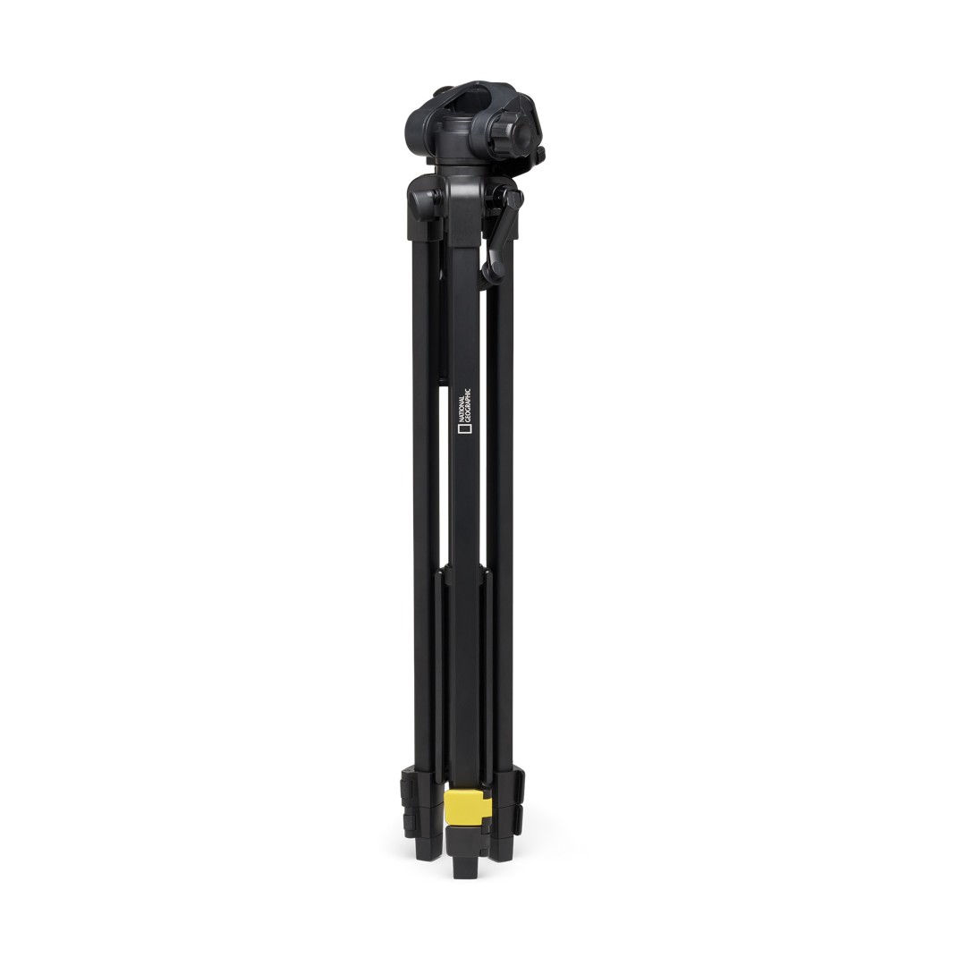 El trípode fotográfico grande Manfrotto NGPT002 National Geographic pesa 988 g; es un kit de aluminio de 3 secciones que se pliega hasta 61 cm, se extiende hasta 1,6 m y soporta 3 kg. Está equipado con una columna central dentada, un cabezal giratorio/inclinable de 3 direcciones, una placa QR patentada, cierres abatibles, un nivel de burbuja, inclinación de 90° para retratos, una abrazadera para smartphone y una funda de transporte; ideal para cámaras DSLR, sin espejo o teléfonos.