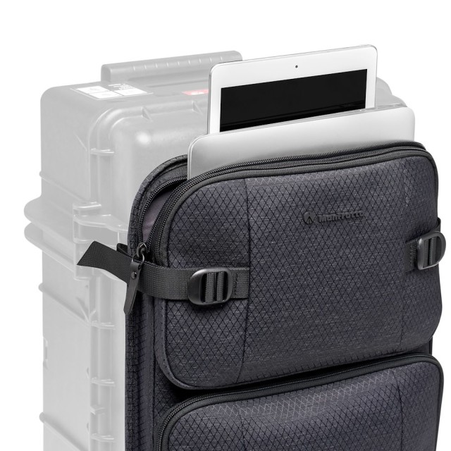 Funda adicional para portátil para las maletas Manfrotto Pro Light Tough. Fácil fijación mediante 4 (o 6, según el modelo) clips metálicos. Todo permanece en su sitio gracias a la resistente correa ajustable. Diseñado para portátiles de hasta 15". En los bolsillos delanteros se pueden guardar otros accesorios, como cargadores, cables y demás. Esta funda también se puede utilizar como funda independiente para portátil con la correa incluida. La funda está fabricada con materiales repelentes al agua.