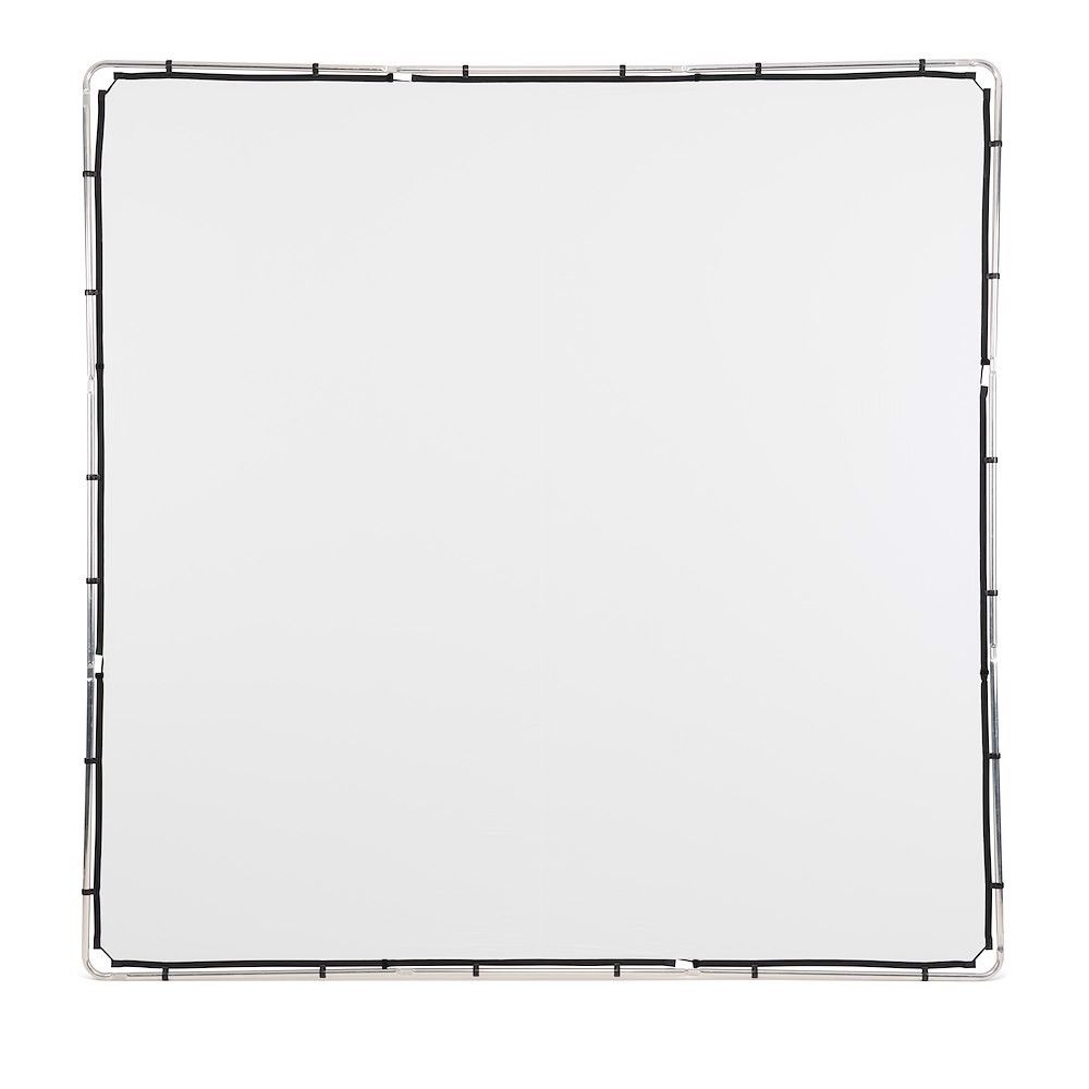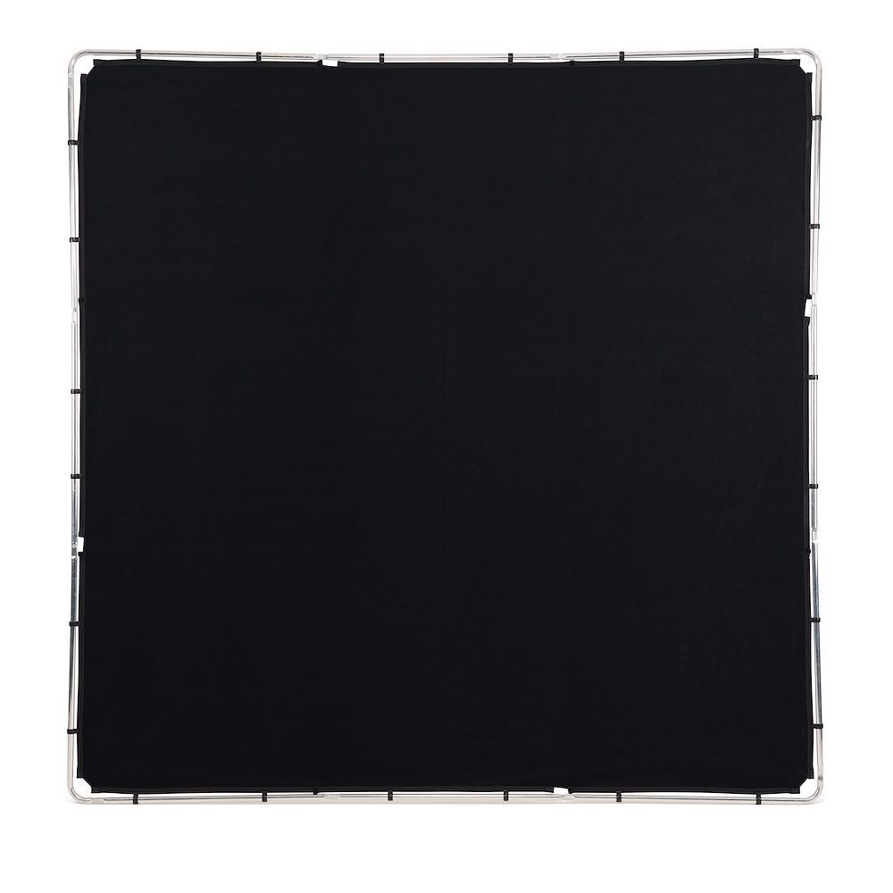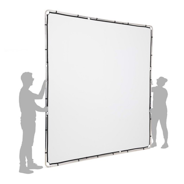 El kit Manfrotto Pro Scrim All In One de 2,9 x 2,9 m (extragrande) incluye: 1 estructura ligera, 2 fundas de tela (una negra y otra difusora de 1,25 grados), 2 cabezales de sujeción, 2 mecanismos de sujeción y una funda de transporte.