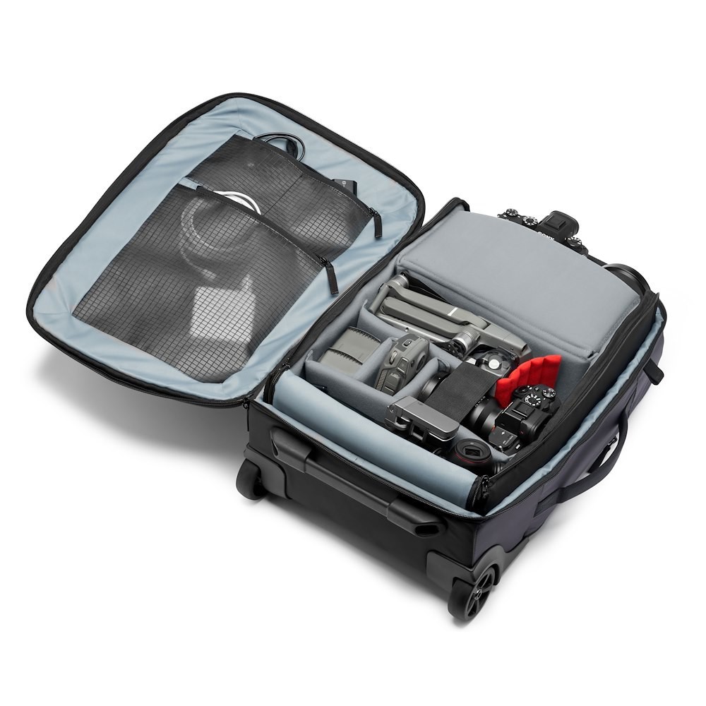 La maleta con ruedas Manfrotto Manhattan Runner-50 es la compañera de viaje ideal para fotógrafos profesionales y viajeros frecuentes. Esta maleta, diseñada para cumplir con las estrictas normas de las aerolíneas en materia de equipaje de mano, combina una protección robusta con una versatilidad increíble. El compartimento principal incluye el innovador interior Flexy Camera Shell, que ofrece una protección totalmente personalizable para cámaras réflex digitales, cámaras sin espejo, objetivos, drones (como la serie DJI Mavic) y otros accesorios. El inserto es extraíble y se puede convertir en una mochila con cómodas correas para los hombros, por lo que obtienes dos bolsas en una. La propia bolsa con ruedas está equipada con ruedas de giro suave y un asa extensible para facilitar el manejo, mientras que el sistema de sujeción para trípode NeverLose te permite transportar de forma segura un trípode o objetos personales, como una chaqueta. El compartimento delantero ofrece un acceso rápido a un portátil de 15 pulgadas, mientras que las correas cruzadas interiores mantienen tus objetos personales bien organizados. El exterior de la bolsa está fabricado con tejido balístico repelente al agua de primera calidad, con una base recubierta para facilitar la limpieza, e incluye una funda impermeable para condiciones climáticas adversas. Con una capacidad de 18,5 l y la capacidad de transportar de forma segura todo el equipo fotográfico, la Manhattan Runner-50 es ideal para fotógrafos y camarógrafos que buscan una solución práctica, resistente y altamente funcional para viajar.