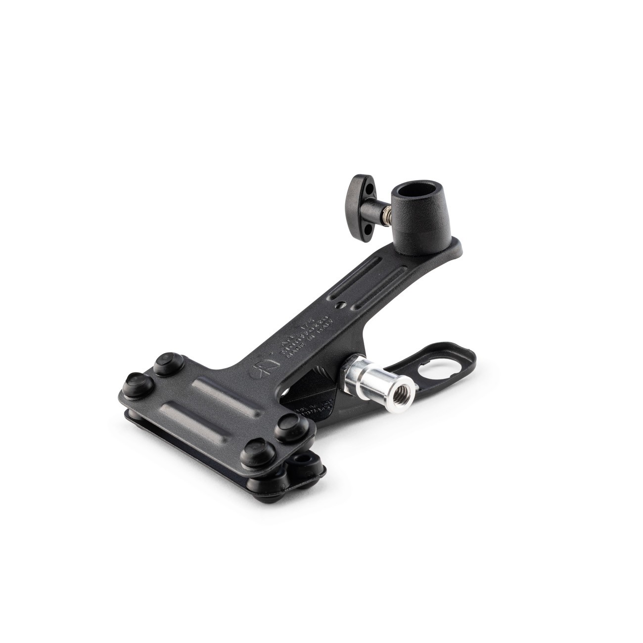 El Manfrotto 175Z es uno de los soportes más versátiles que se han fabricado jamás. Sus robustas mordazas con resorte se abren hasta una anchura de 40 mm y están recubiertas con almohadillas de goma protectoras, mientras que una de las asas cuenta con un tornillo Baby de 16 mm integrado con rosca de 1/4″-20, lo que permite fijar al instante rótulas, pequeñas luces, brazos articulados o cualquier otro elemento con un tornillo de 1/4″. Los fotógrafos lo utilizan para sujetar reflectores, banderas, fondos o para crear rápidamente estructuras elevadas fijándolo a estantes, puertas o soportes de iluminación. Ligera, compacta (15,6 cm plegada) y resistente, es una abrazadera que tiene un lugar permanente en la bolsa de cualquier profesional.