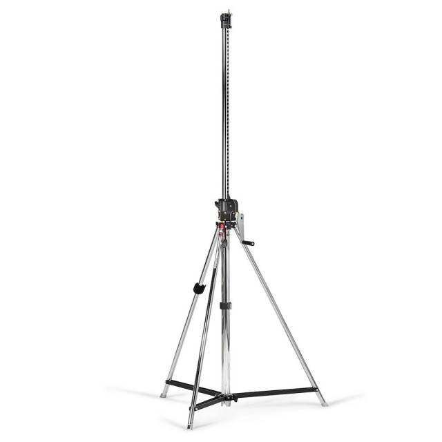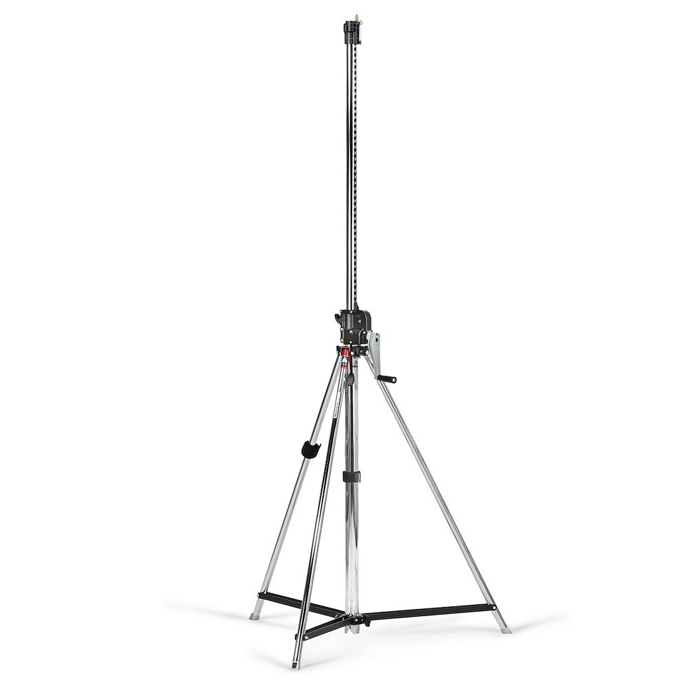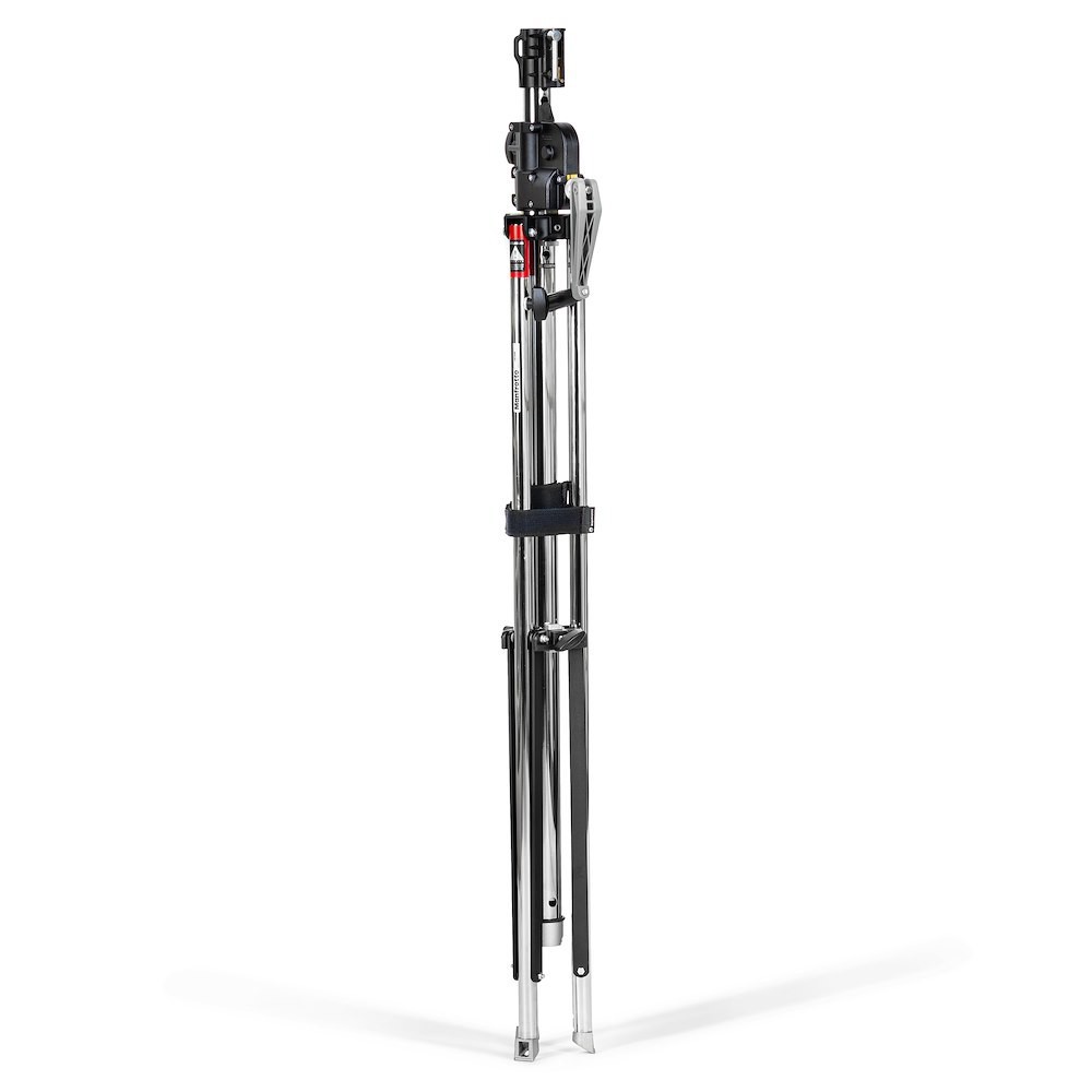 El Manfrotto 083NW es un resistente trípode Wind Up de acero cromado negro de dos secciones que eleva con seguridad cargas de hasta 45 kg (30 kg a una altura máxima de 247 cm) mediante una sola manivela manual; está equipado con una pata niveladora integrada, soportes superiores universales Junior/Baby y permite acoplarle juegos de ruedas opcionales (104/104G), lo que lo convierte en el trípode de estudio de alta capacidad de carga más seguro para luces grandes, bastidores aéreos y equipos pesados.