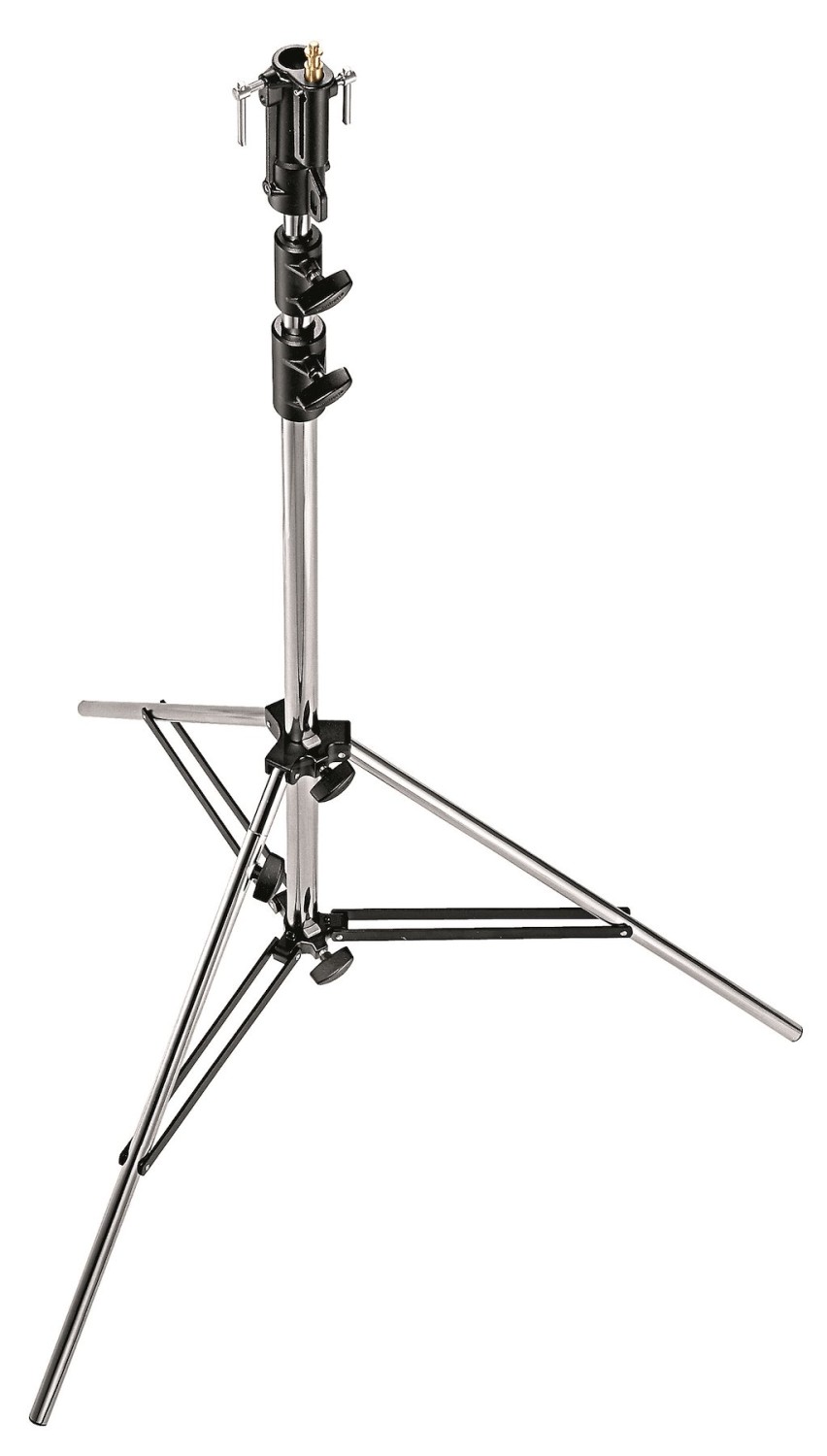 El trípode está fabricado en acero cromado y cuenta con tres secciones, dos extensiones de altura y abrazaderas autoblocantes que garantizan que el trípode permanezca firmemente fijado a la altura seleccionada. Su base de patas con doble refuerzo proporciona una rigidez excepcional, lo que le permite soportar con seguridad equipos de iluminación de hasta 20 kg.