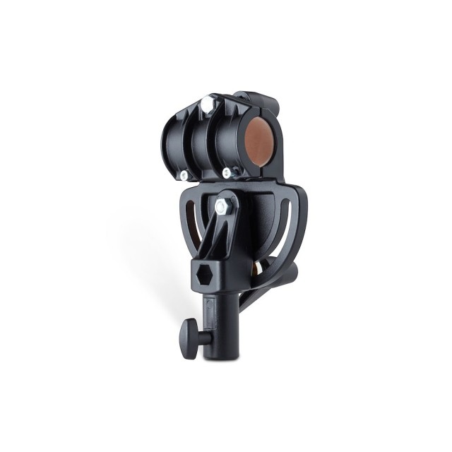 La abrazadera está equipada con una toma de 5/8″ (16 mm) y un conector de 1/8″, y es compatible con una amplia gama de accesorios fotográficos y cinematográficos. Su mecanismo giratorio permite un posicionamiento preciso del brazo, lo que resulta ideal para setups de iluminación o cualquier situación que requiera un ajuste dinámico del ángulo. Con un peso de 0,8 kg, ofrece un equilibrio entre resistencia y portabilidad para uso profesional.