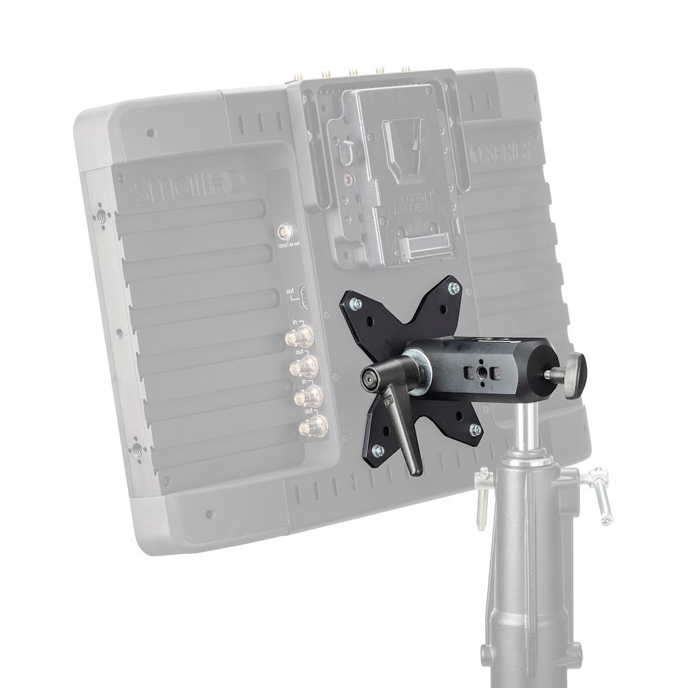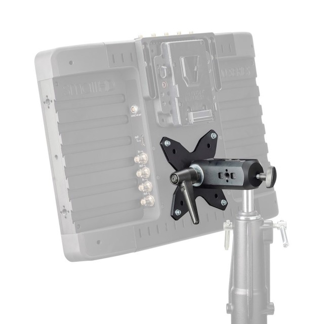 Una vez que el soporte está fijado de forma segura al monitor elegido, se puede acoplar a cualquier soporte adecuado, como un trípode de iluminación, un brazo o una placa de pared, mediante un manguito de 16 mm (5/8”), y todo se fija con una rueda en T en cualquier posición, ya sea en orientación vertical u horizontal. La inclinación vertical se puede ajustar mediante una manivela con llave dinamométrica, lo que permite al usuario realizar pequeños ajustes de forma segura según sea necesario.