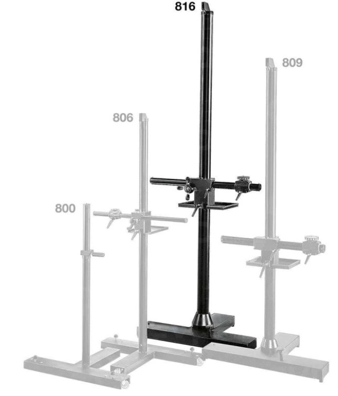 El trípode Manfrotto Tower Stand de 260 cm (modelo 816 / 816.2), también conocido como Super Salon 280, es un trípode de estudio profesional y resistente diseñado para ofrecer la máxima estabilidad y altura en estudios fotográficos. Está equipado con un robusto poste de aluminio anodizado de 10 cm de diámetro, montado sobre una base de hierro fundido en forma de «T» con ruedas bloqueables de giro suave, una barra transversal horizontal de 100 cm con accionamiento dentado de precisión, contrapesos de equilibrio y una plataforma universal para el montaje de la cámara, lo que lo hace ideal para montar cámaras de gran tamaño con una capacidad de carga de hasta 25 kg a una altura de hasta 274 cm.