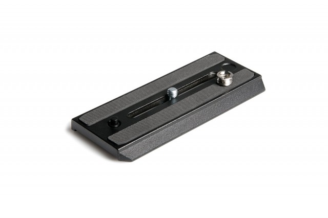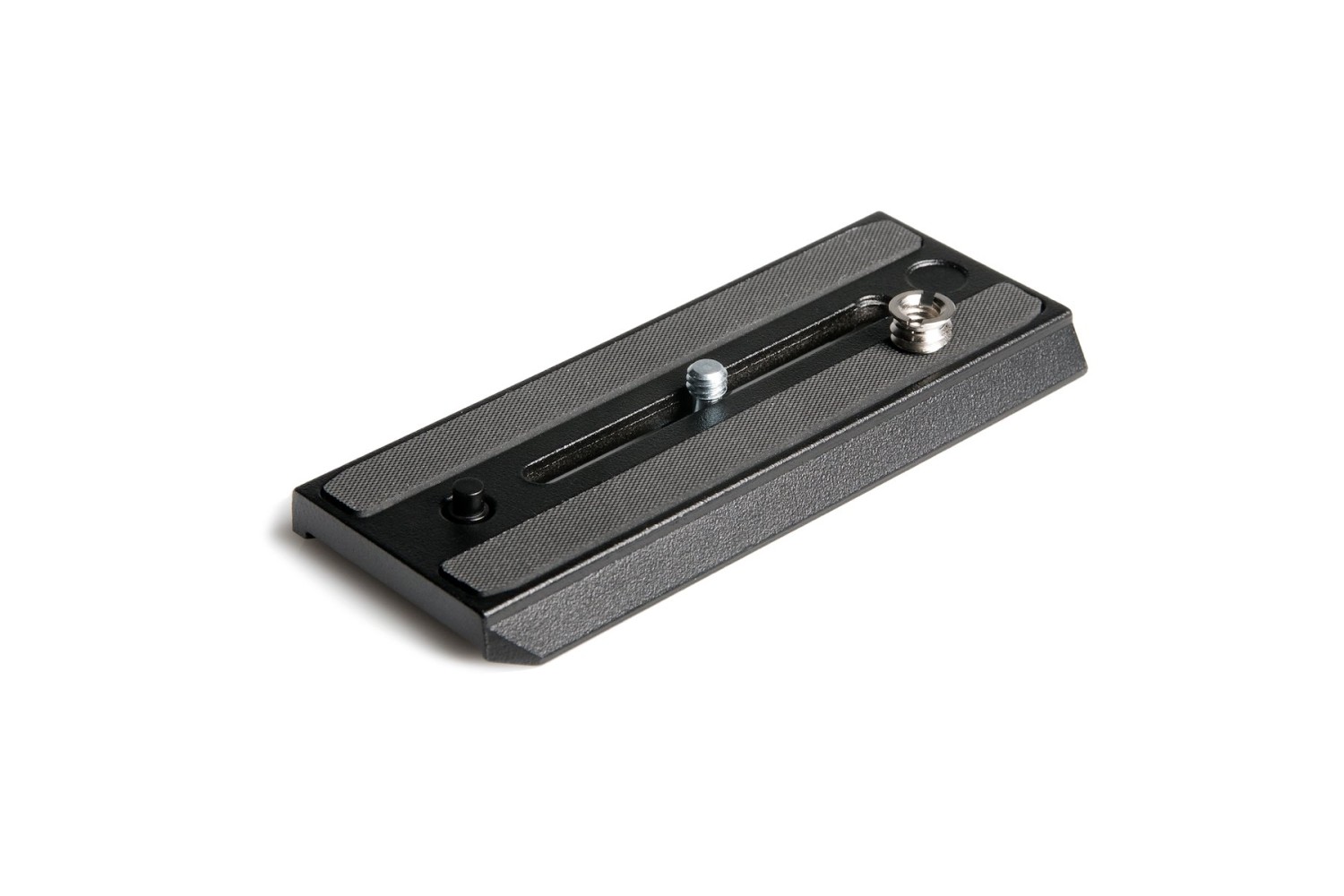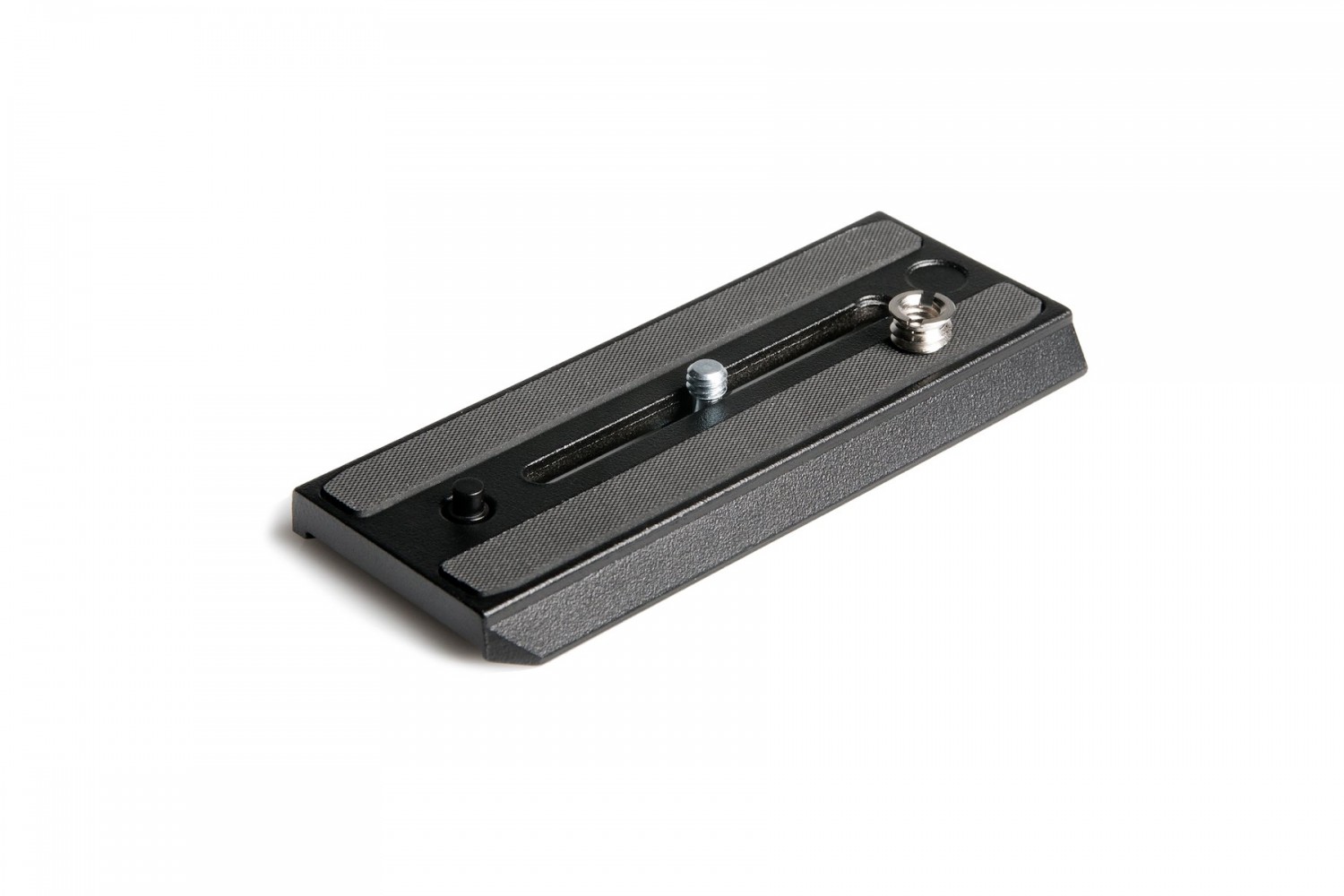 Placa para cámara de vídeo Esta versión alargada de la placa estándar permite equilibrar a la perfección las videocámaras con una distribución del peso poco habitual, debida a los objetivos telescópicos largos o a las baterías pesadas. Se suministra con un tornillo de 1/4" y un adaptador de 1" a 3/8" para cámaras, así como con un pasador antirrotación.
