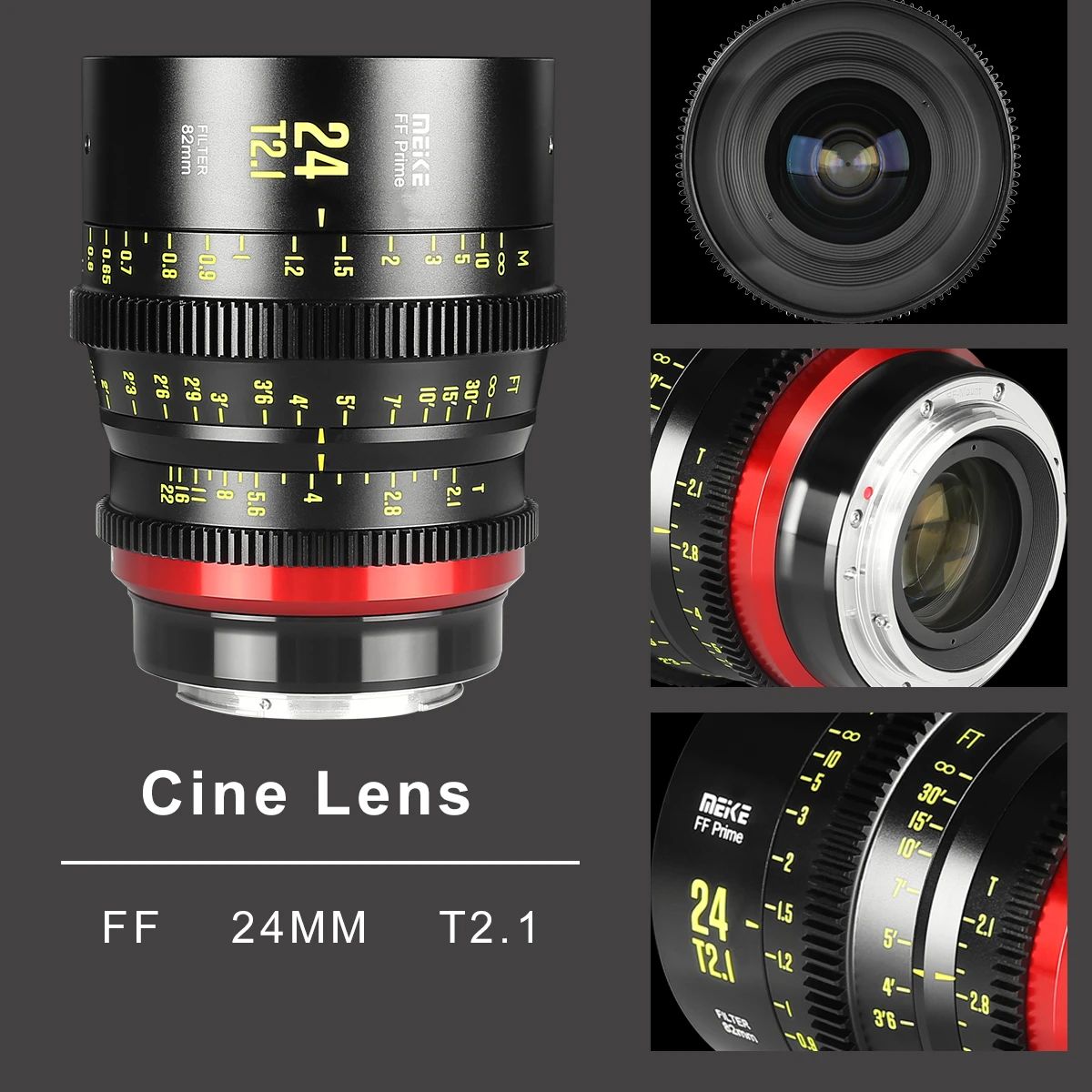El objetivo Meike 24 mm T2.1 de la serie FF-Prime Cine tiene un diámetro de 45 mm, es compatible con todas las cámaras FF y se suministra con montura PL/EF/RF/E/L. Gracias a ello, es compatible con cámaras DSLM de Sony, Panasonic, Canon, Sigma y Leica equipadas con sensores de tamaño FF/Super 35/APS-C, así como con la Canon C700, la Sony Venice, la Alexa LF, la Z Cam E2-F6, la Mavo LF, etc. Por supuesto, el paquete incluye una rueda dentada estándar para el anillo de enfoque de M0,8 mm y un parasol lateral.La serie FF-Prime Cine ofrecerá los modelos 16 mm T2.1, 24 mm T2.1, 35 mm T2.1, 50 mm T2.1, 85 mm T2.1, 105 mm T2.1 y 135 mm T2.1 .