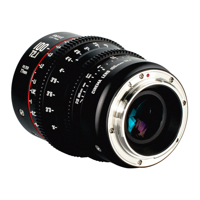 Objetivo cinematográfico Meike Prime 100 mm T2.1 para sistemas de cámaras de cine con formato Super 35, como RED Komodo, BMPCC 6K, BMPCC 6K Pro, Z CAM S6 y Canon C70, entre otros.