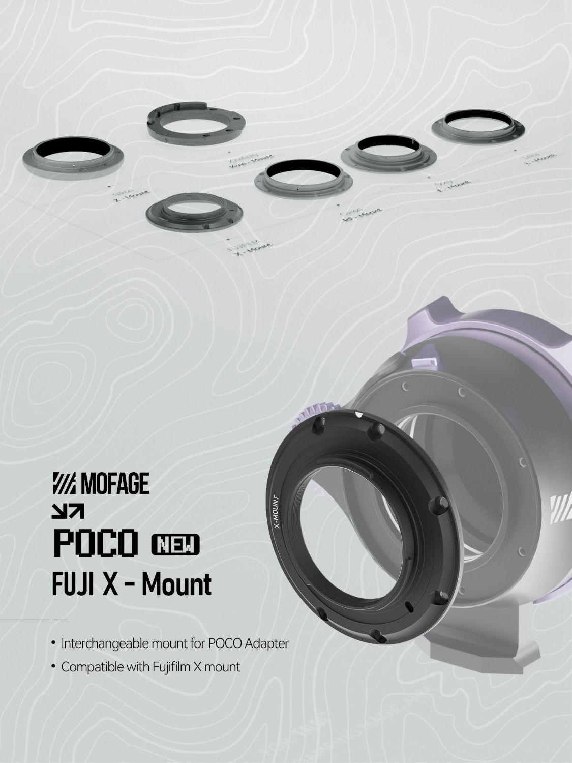 Este adaptador amplía la compatibilidad del adaptador POCO de Mofage. Es compatible con cámaras con montura Fuji X-mount.