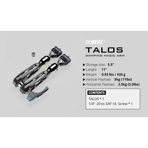 El Mofage Talos Damping Magic Arm - Beige es un brazo articulado universal diseñado para la fijación segura y estable de cámaras, monitores, luces y accesorios. Este brazo de soporte de 11" (27,9 cm), con rótulas ajustables en ambos extremos, una gran palanca de bloqueo y una robusta capacidad de carga de 11 libras (5 kg), garantiza un posicionamiento flexible. Incluye un adaptador de 1/4"-20 a 3/8"-16 y pasadores de posicionamiento retráctiles para aumentar la estabilidad del montaje.