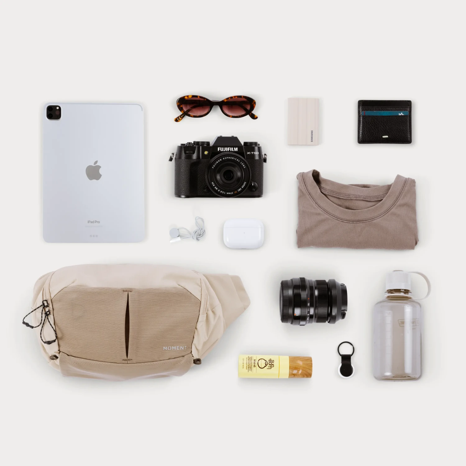La correa incorpora un bolsillo tipo bandolera con un ligero acolchado y un clip independiente para que el teléfono, las llaves, los AirPods o los objetivos móviles estén siempre a mano.