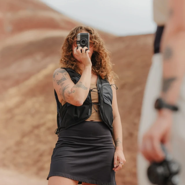 Correas frontales inspiradas en los chalecos, con un bolsillo elástico con cremallera y un bolsillo elástico de acceso rápido para acceder fácilmente a la cámara, la película, el teléfono, los filtros o un pequeño tentempié.