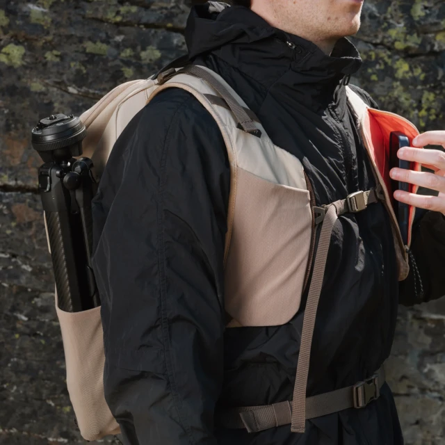 Correas para los hombros inspiradas en los chalecos, con bolsillos elásticos con cremallera y un canal integrado para la carga MagSafe, para un acceso rápido a la cámara, la película, el teléfono, los filtros y un pequeño tentempié directamente sobre el cuerpo.