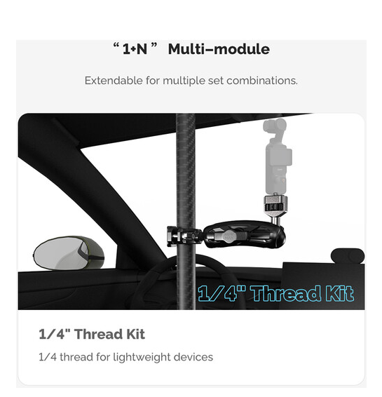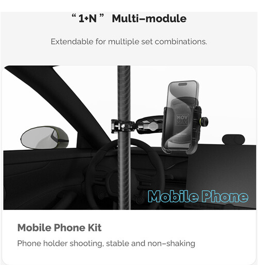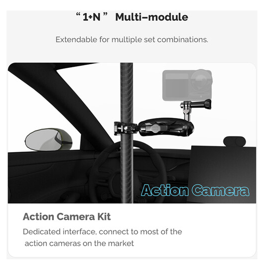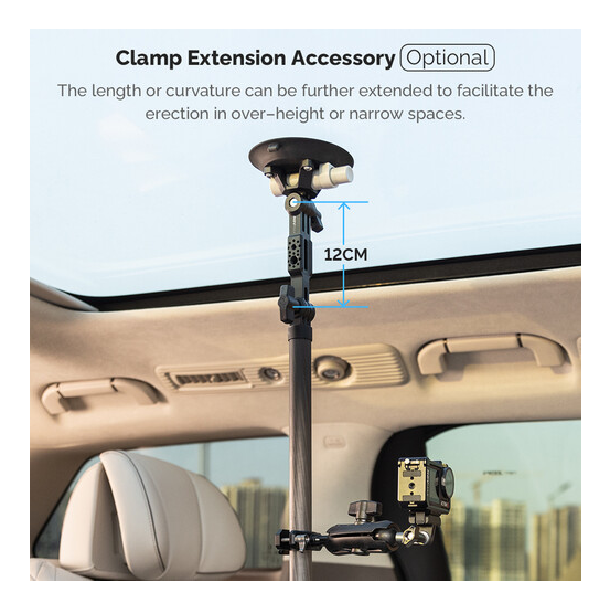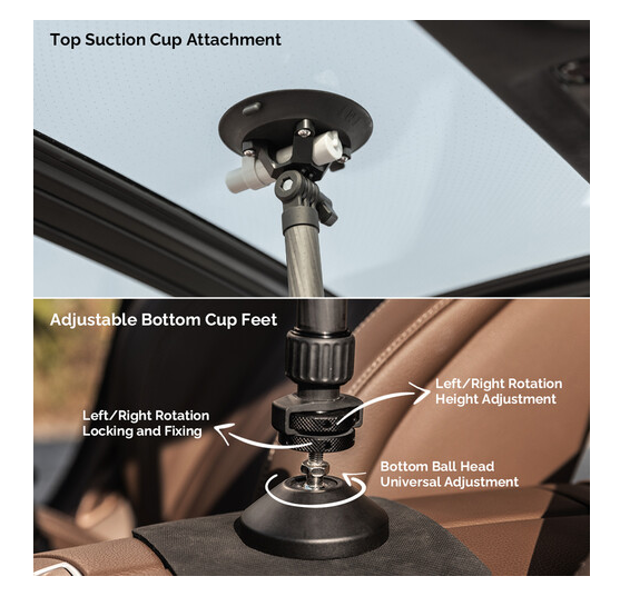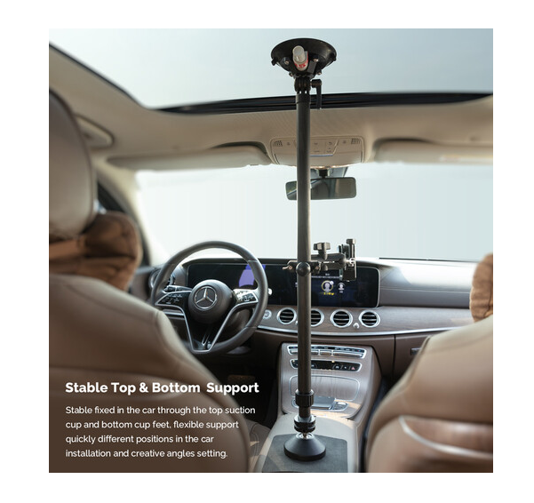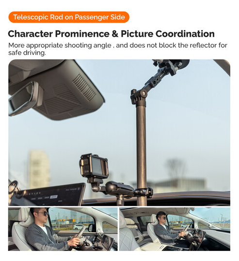 La barra telescópica ajustable MOVMAX con soporte de tres puntos es un sistema profesional para fijar la cámara en el vehículo, diseñado para obtener imágenes nítidas en primera persona sin vibraciones a través del parabrisas del vehículo mediante cámaras de acción, como la GoPro. La robusta barra telescópica de aluminio se ajusta de forma continua de 76 a 122 cm para adaptarse a diferentes tamaños de cabina y se bloquea de forma segura en cualquier longitud. El extremo superior está equipado con una ventosa de alta resistencia que se fija de forma fiable a la ventanilla del techo o al cristal del techo, mientras que la ventosa inferior se ancla firmemente a la consola central o al salpicadero, garantizando así una gran estabilidad al conducir a alta velocidad o por terrenos irregulares. Este kit incluye un juego completo de articulaciones: un soporte de tres puntos estilo GoPro con rótula integrada, un brazo con doble rótula para girar e inclinar 360° y una abrazadera de varilla especial con rótula para fijar dispositivos secundarios o ajustar con precisión los ángulos. El sistema es ideal para creadores de contenido automovilístico, cineastas de deportes de motor y vlogueros, y ofrece una colocación flexible de la cámara sin necesidad de usar las manos, con una restricción mínima del interior y un control creativo máximo.