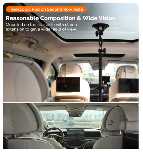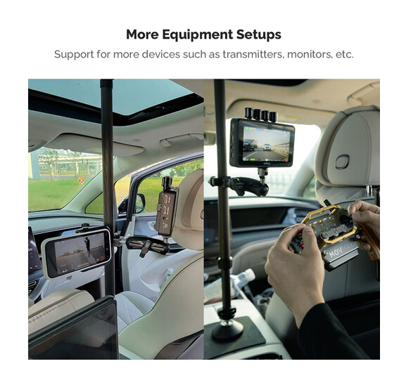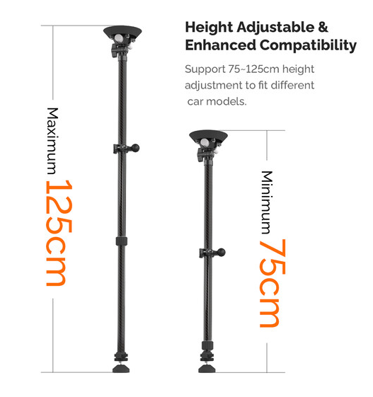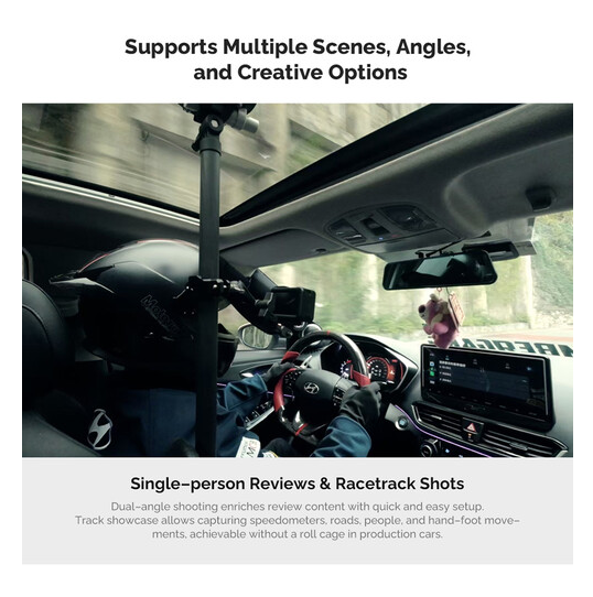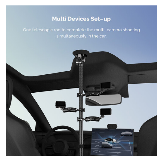El palo telescópico ajustable MOVMAX con soporte para smartphone es una solución profesional para capturar imágenes fluidas y de alta calidad en primera persona a través del parabrisas del vehículo utilizando smartphones o dispositivos móviles compactos. La barra está fabricada en fibra de carbono de primera calidad y, gracias a un seguro sistema de bloqueo giratorio, se extiende de forma continua de 75 a 125 cm, adaptándose así a diferentes interiores de vehículos, desde sedanes hasta SUV. La ventosa superior se fija de forma segura al cristal de la ventanilla del techo, mientras que la pata inferior se fija a la consola central o al salpicadero, creando un marco rígido y resistente a las vibraciones, ideal para conducir a alta velocidad o por terrenos irregulares. Este kit incluye una abrazadera con resorte para smartphone con rótula de 1" integrada (apta para dispositivos de 2,2 a 3,5" de ancho), un brazo de 3,9" con rótula doble para un giro de 360° y control total de la inclinación, y una abrazadera de varilla con rótula para fijar accesorios secundarios, como luces o micrófonos. El sistema es ideal para vlogueros, críticos de automóviles y cineastas móviles, y garantiza un encuadre preciso, vibraciones mínimas y máxima flexibilidad creativa en condiciones dinámicas de grabación en el coche.