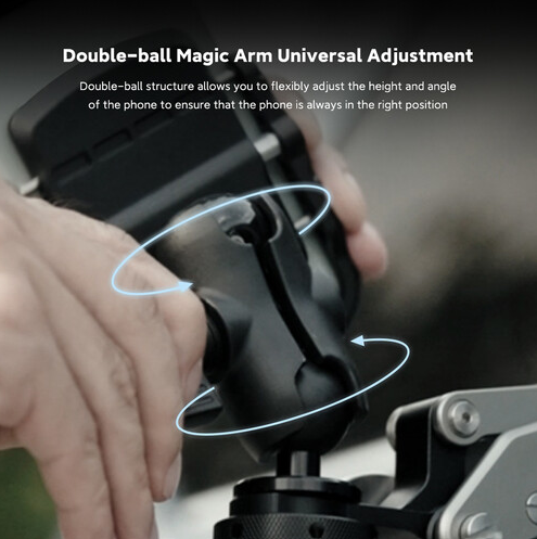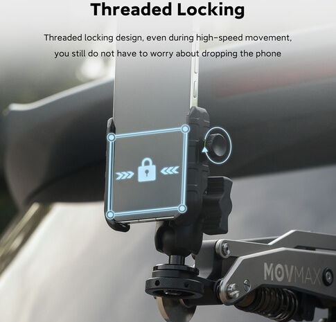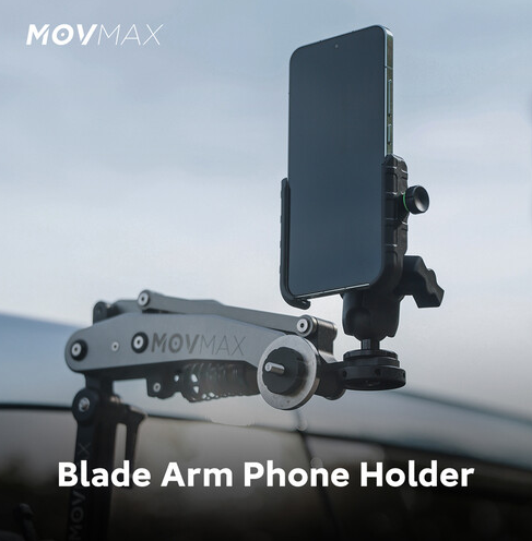El soporte MOVMAX Smartphone Clamp (86-0039) permite fijar teléfonos de entre 2,4 y 3,5 pulgadas al brazo Blade Arm con rótula de 1/4"-20 para un ajuste vertical/horizontal completo, incluye un mando a distancia Bluetooth para disparar la cámara en el coche y utiliza un acolchado de silicona para que los dispositivos permanezcan sin arañazos y estables durante los vlogs desde vehículos a alta velocidad.