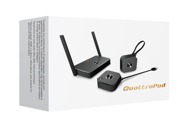 El NimbleTech QuattroPod Mini 2T1R es un sistema de presentación inalámbrico con numerosas funciones, diseñado para entornos profesionales que requieren varios ponentes y una colaboración inmediata. El paquete incluye un receptor QuattroPod (R01) y dos transmisores compatibles con HDMI (T02), que permiten a los usuarios cambiar fácilmente entre presentadores y compartir contenido de forma inalámbrica con una impresionante resolución 4K UHD.