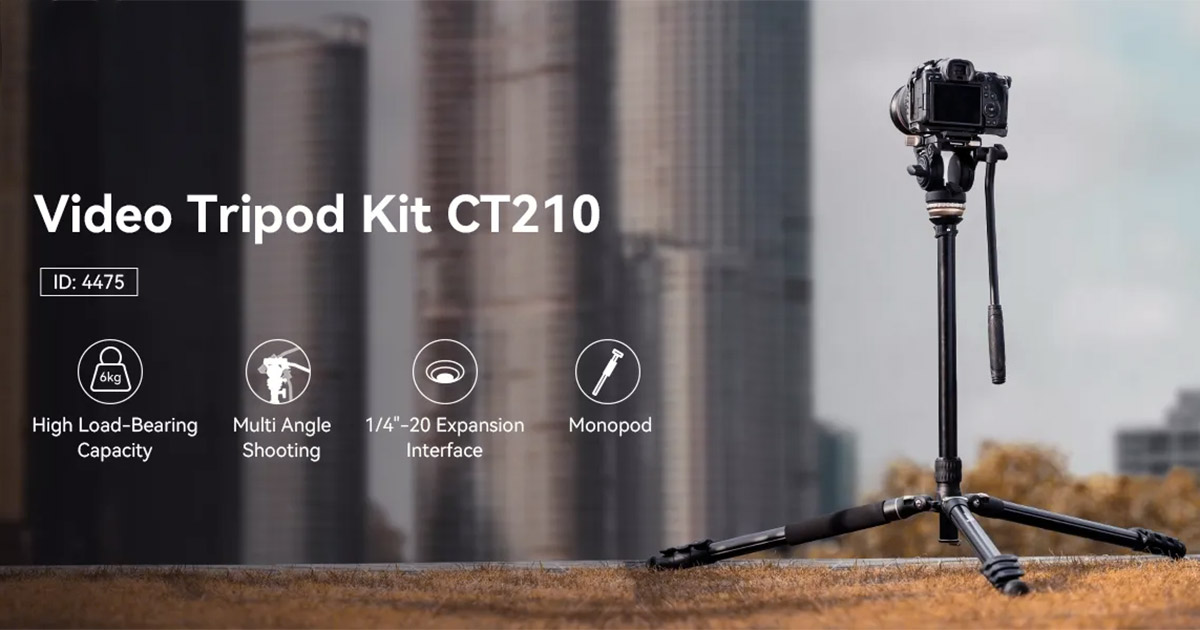 En stock: trípode de vídeo nuevo de aluminio Kit de trípode de vídeo SmallRig CT210 (4475). La base de cuatro segmentos con cierres de fijación rápida permite un rango de altura de 29 a 192 cm (o un máximo de 155 cm sin extender el poste central) y soporta hasta 15 kg con un peso propio de aproximadamente 2,53 kg (y una longitud de 61 cm cuando está plegado). El cabezal de vídeo incluido tiene una capacidad de carga de hasta 6 kg y permite equilibrar con suavidad conjuntos de hasta 3 kg; cabe destacar el nuevo sistema de placas de fijación rápida, compatible con los sistemas Manfrotto o DJI RS 2/RS 3/RS 3 Pro. No falta la rosca de 1/4"-20 para montar otros accesorios (por ejemplo, el soporte para teléfonos móviles incluido mediante una barra opcional, etc.) ni la posibilidad de desmontar una de las patas de la base y utilizarla como monopié (60-200 cm)...