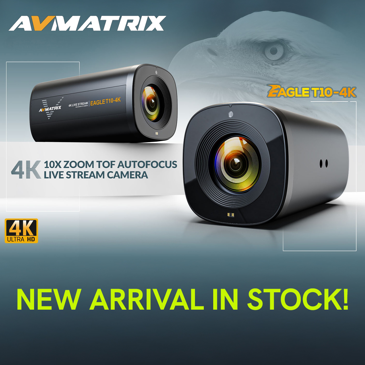 ¡Ya tenemos en stockla novedad de AVMatrix: su Eagle T10 4K! Esta nueva cámara 4K compacta, con interfacesHDMIyUSB-C, es ideal tanto para grabar como para retransmitir en directo. Cuenta con un objetivo zoomgran angular integrado (10x)yun sensor CMOS de 8 Mpx y 1/2,8". El cuerpo de la cámara está fabricado en una resistente aleación de aluminio. La AVMatrix Eagle T10 4K le ofrece una amplia gama de presets de efectos, controlmediante mando a distancia por infrarrojos,reducción de ruido 2D/3D, función de inversión de imagen H/V, etc.