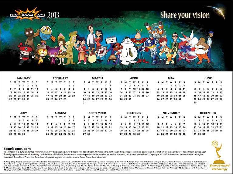 Los especialistas en software de animación Toon Boom, cuyas populares aplicaciones Toon Boom Studio y Toon Boom Storyboard Pro forman parte de nuestra oferta desde hace ya muchos años, han publicado un calendario en formato PDF para todos sus usuarios y seguidores. El archivo PDF para imprimir está disponible en la página web toonboom.com.