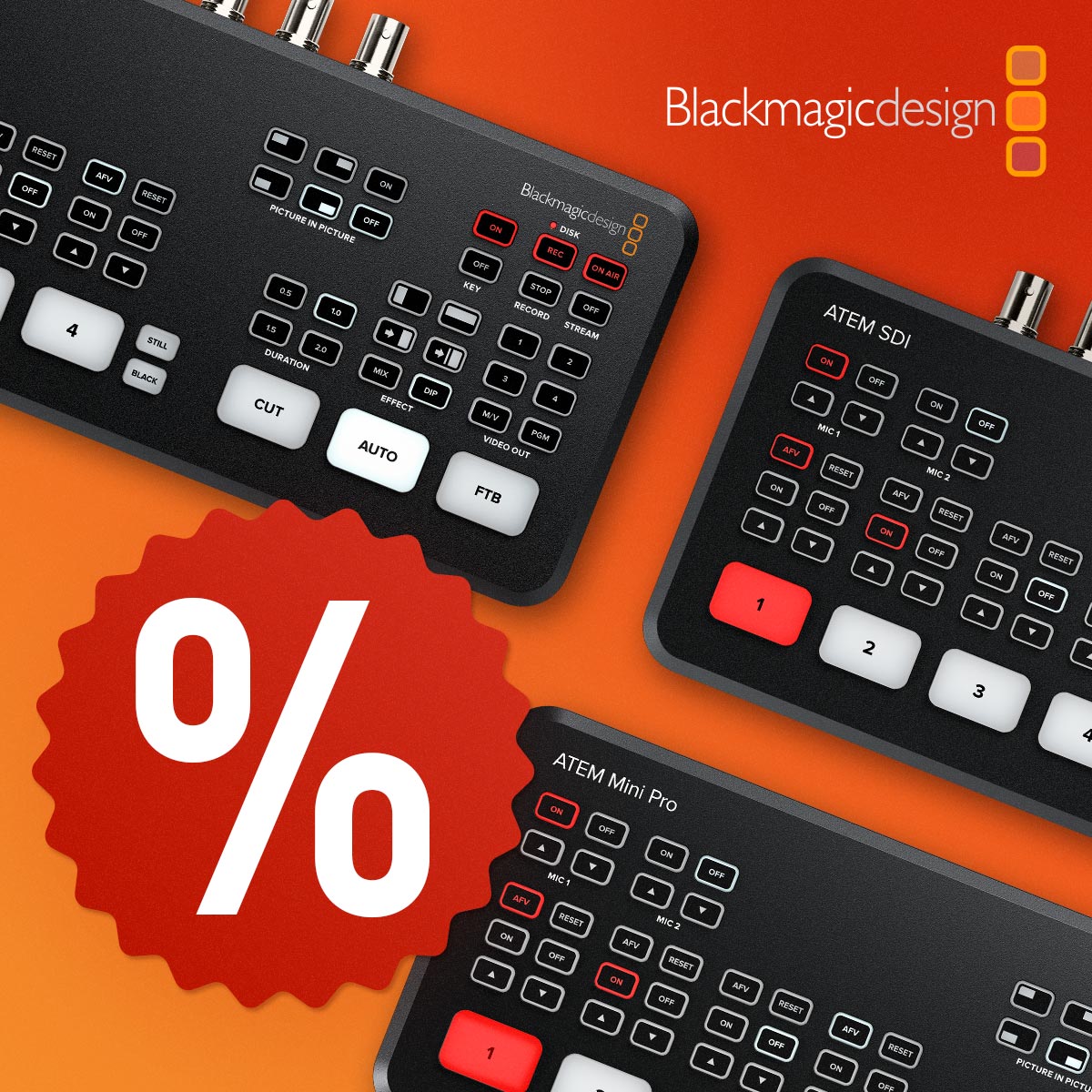 ¡En esta oferta limitada por el tiempo y las existencias del fabricante, puedes conseguir cualquier unidad de control compacta de la serie Blackmagic ATEM Mini/SDI con un importante descuento! La promoción es válida únicamente para los modelos ATEM Mini y ATEM SDI (concretamente ATEM Mini Pro, ATEM Mini Pro ISO, ATEM Mini Extreme, ATEM Mini Extreme ISO, ATEM SDI, ATEM SDI Pro ISO y ATEM SDI Extreme ISO) y solo durante el plazo indicado o hasta nuevo aviso.