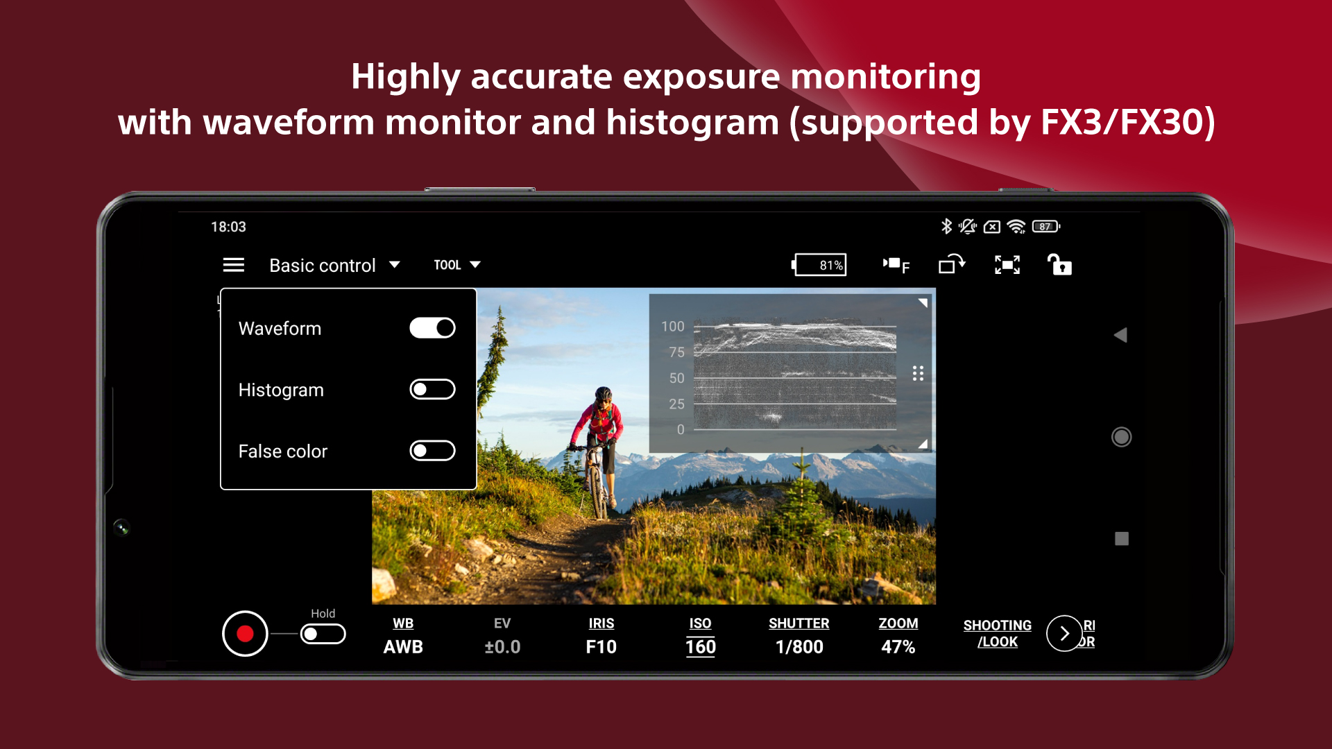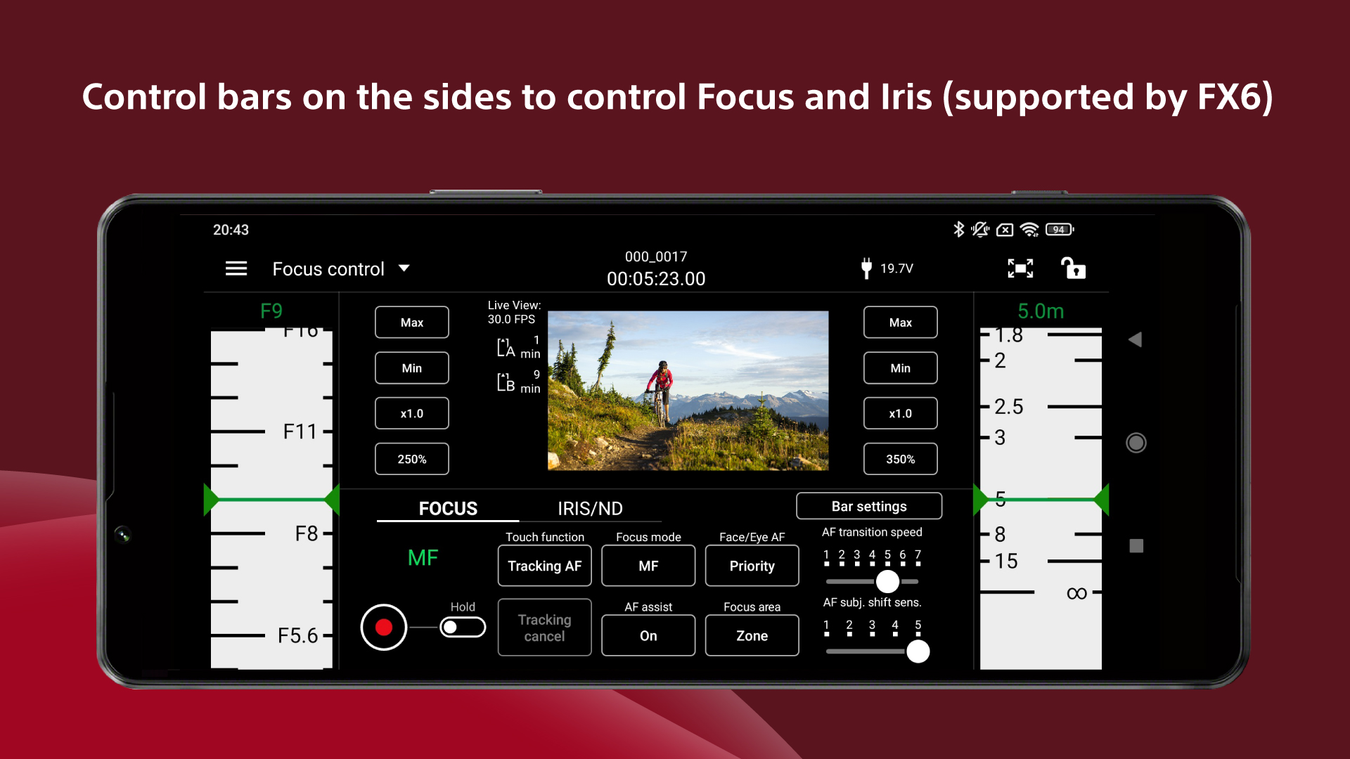 Nueva aplicación «Monitor & Control» para las cámaras Sony FX6 (FW 3.00 o posterior), FX3 (4.00+) y FX30 (3.00+) y dispositivos móviles con sistemas Apple iOS (itunes.apple.com/us/app/id1643900558) o Google Android (play.google.com/store/apps/details?id=jp.co.sony.playmemoriesmobile.proremote) ofrecen monitorización inalámbrica, ajustes precisos de exposición y un cómodo control del enfoque en las grandes pantallas de los smartphones o tabletas.