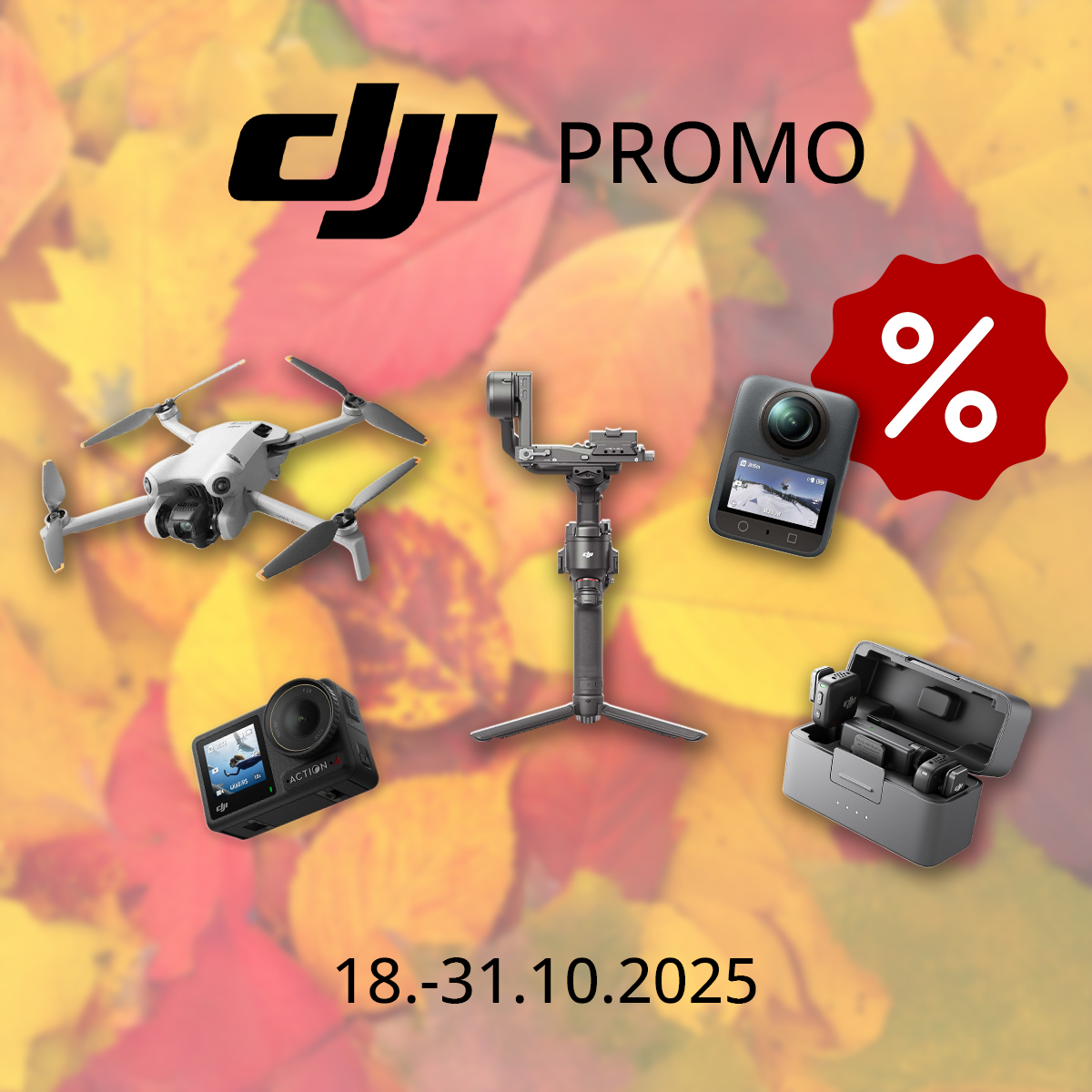 Del 18 al 31 de octubre de 2025,tenemos preparadasparatirebajasprogresivasen dos grupos de productosDJI. Gracias a esta promoción, podrás hacerte no solo condrones de última generación,micrófonos inalámbricos ycámaras de acción, sino también conestabilizadoresDJI condescuentos de hasta el 34 %!
