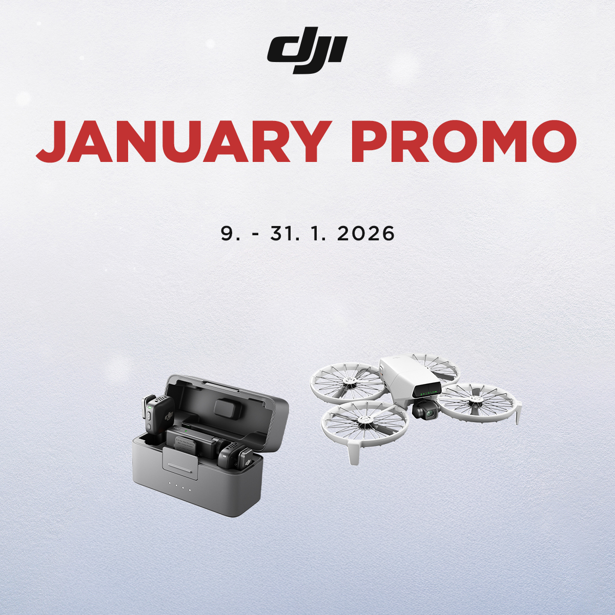 Del 9 al 31 de enero de 2026,tenemospreparadasparatirebajasprogresivasen 4 grupos de productosDJI. Gracias a esta promoción, podrás hacerte no solo condrones de última generación yestabilizadoresparamóviles, sino también concámaras de acción o micrófonos DJI condescuentos de hasta el 38 %!