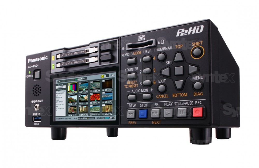 Nuevo deck P2 compatible con formatos 3D y 24p. Grabación AVC-Intra, audio de 24 bits, posibilidad de reproducción desde un disco USB 3.0 externo, conversión ascendente, descendente y cruzada de formatos durante la reproducción. Se puede conectar un teclado para editar metadatos o, por ejemplo, un Jog/Shuttle para un control más natural. Entradas y salidas HD/SD SDI y salida HDMI. Control externo vía RS422 y posibilidad de funcionamiento con batería (aprox. 3 horas de autonomía).