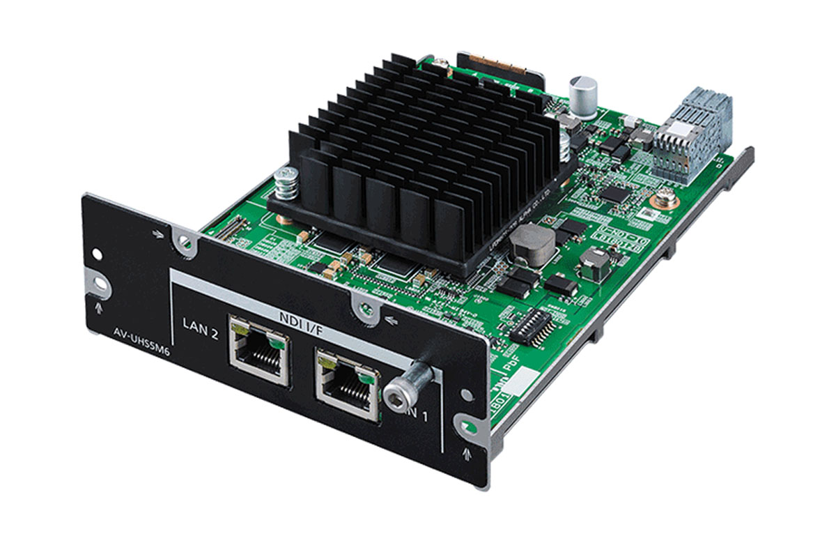 Tarjeta opcional para la mesa de mezclas SDI/HDMI AV-UHS500, compatible con los estándares de vídeo IP NDI y NDI|HX. Ofrece conexión directa con ordenadores y productos de vídeo compatibles con NDI para una instalación extremadamente sencilla de la sala de control en la infraestructura IP de estudios fijos y móviles, incluyendo salas de conciertos, teatros, estudios de televisión, etc. 4. º trimestre de 2021.