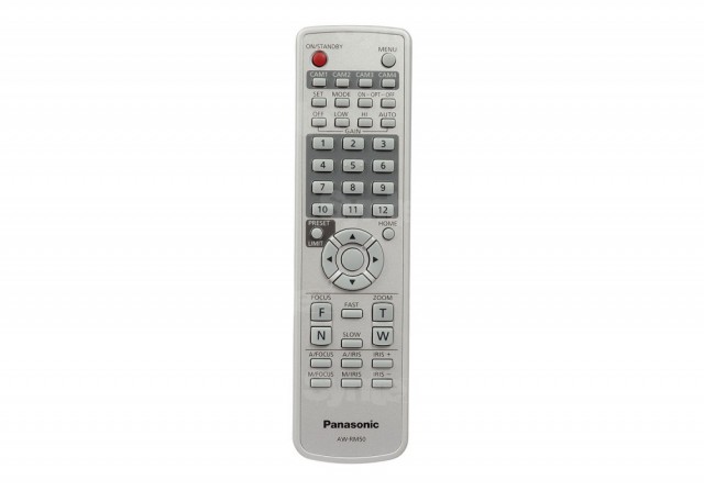 El mando a distancia por infrarrojos para cámaras PTZ de Panasonic permite controlar hasta cinco cámaras, incluyendo su movimiento (con la posibilidad de seleccionar la velocidad de respuesta), los modos de enfoque automático y de diafragma, el ajuste manual del enfoque, el diafragma y la ganancia, así como la posibilidad de guardar y recuperar preajustes. Se puede acceder a otros parámetros desde el menú en pantalla.