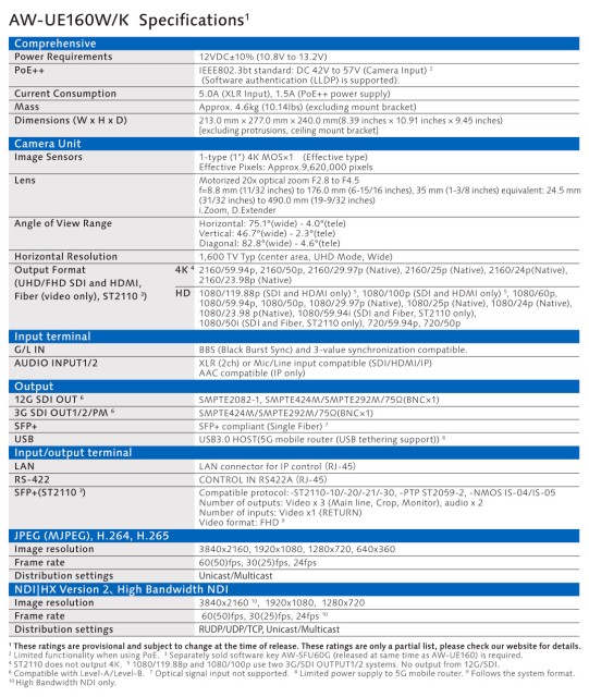 ¡La Panasonic AW-UE160W/K es una cámara de instalación 4K de nueva generación diseñada para la retransmisión de programas en directo con la máxima calidad! El nuevo buque insignia de la flota PTZ de Panasonic ofrece la flexibilidad de las cámaras de instalación controladas a distancia, así como la calidad de imagen y las funciones de los modelos de estudio y cinematográficos. El software opcional AW-SFU60 la convierte además en la primera cámara PTZ del mercado compatible con el estándar IP SMPTE ST2110. A la venta a partir del primer trimestre de 2023.