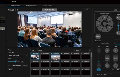 El ecosistema completo de cámaras PTZ de Panasonic incluye también el software PTZ Control Center, mandos a distancia opcionales y software opcional para el seguimiento automático de ponentes, incluida la detección de rostros.