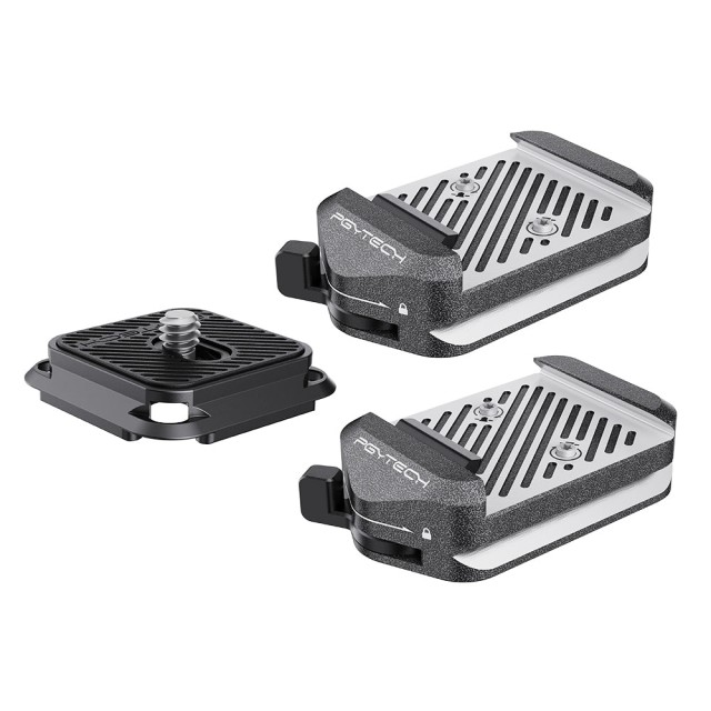 El juego PGYTECH Arca-Type Quick Release Clamp V2 es un conjunto de dos pinzas de liberación rápida y una placapara una fijación rápida y fiable de la cámara.