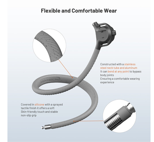 El tubo ajustable para el cuello está fabricado en acero inoxidable y aluminio, lo que lo hace lo suficientemente flexible como para doblarse hasta el ángulo perfecto, a la vez que se mantiene resistente y estable. El suave revestimiento de silicona, agradable al tacto, proporciona comodidad durante un uso prolongado y cuenta con una superficie antideslizante que garantiza la estabilidad de las tomas.