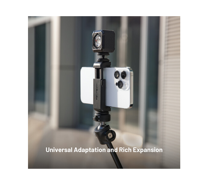 El soporte universal para smartphone es apto para teléfonos de 2,4 a 3,6 pulgadas de ancho, cuenta con juntas de silicona que protegen tu dispositivo e incluye un soporte para accesorios. Su sistema de desbloqueo con un solo toque y su rosca interna de 1/4"-20 permiten un ajuste rápido y la compatibilidad con trípodes. Gracias a su construcción de alta calidad en aluminio, acero y plásticos resistentes, esta combinación garantiza comodidad y fiabilidad al grabar durante tus viajes.