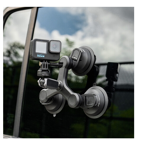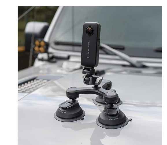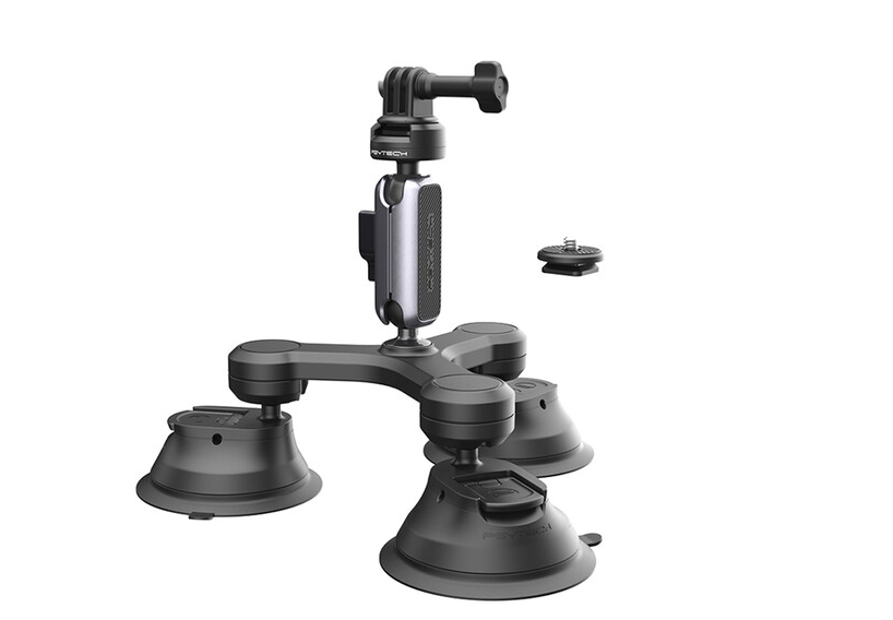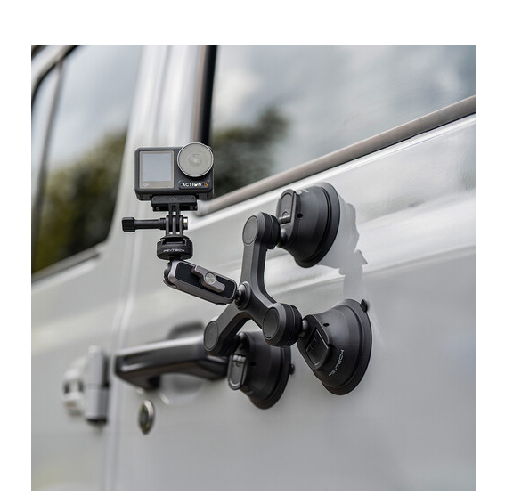 Captura imágenes estables con calidad profesional en vehículos o superficies planas con el soporte de ventosas de tres brazos PGYTECH. Este soporte está equipado con tres ventosas de alto rendimiento, una rótula de fijación rápida CapLock y una rotación ajustable de 360°, lo que garantiza la máxima estabilidad y una colocación versátil de la cámara para cámaras de acción y smartphones.