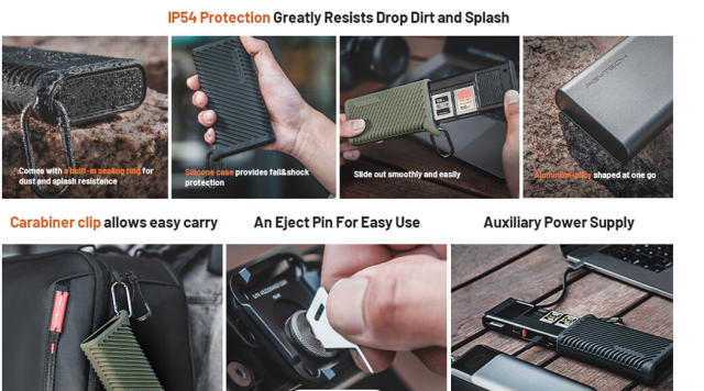 La carcasa de aluminio con clasificación IP54, protección de silicona y junta de sellado protege contra caídas, polvo y salpicaduras, mientras que el mosquetón permite fijarla fácilmente a las bolsas. El puerto de alimentación auxiliar USB-C (5 V/2 A) garantiza una transferencia de datos estable. La compatibilidad plug-and-play se aplica a dispositivos con sistemas Windows, macOS, Linux, Android y iPadOS, lo que facilita la transferencia de datos desde cámaras, drones o cámaras de acción a tus dispositivos. La carcasa del lector de tarjetas, compacta, ligera y muy resistente, es una solución universal para la gestión de archivos multimedia durante los viajes.