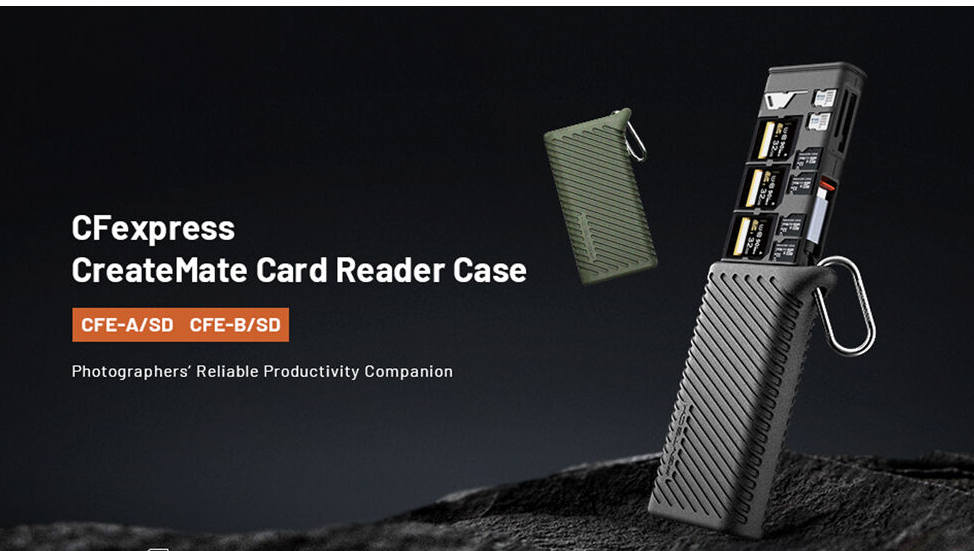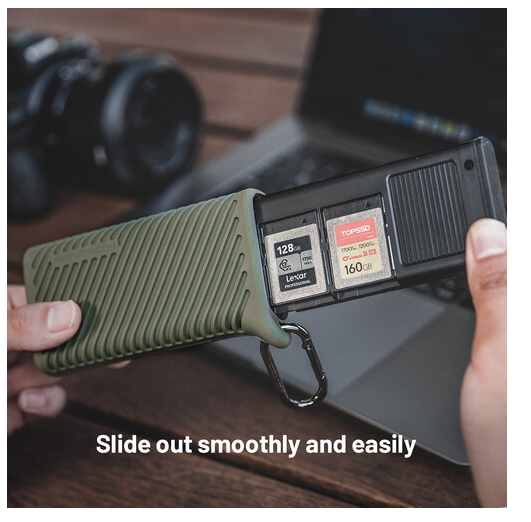 Transmisión y almacenamiento de tarjetas de memoria con el estuche PGYTECH P-GM-168 CreateMate CFexpress Type A/SD Card Reader Case en color verde musgo. Gracias a su transferencia de datos ultrarrápida de hasta 1000 MB/s, sus dos ranuras para tarjetas CFexpress Type A y UHS-II SD, su protección IP54 y su capacidad para 12 tarjetas, este estuche «todo en uno» es ideal para fotógrafos y videógrafos que viajan.