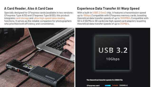 La funda PGYTECH CreateMate CFexpress Type B / SD Card Reader Case combina un almacenamiento resistente y una transferencia de datos ultrarrápida en un único dispositivo compacto. La funda está fabricada en aleación de aluminio con una cubierta protectora de silicona y puede albergar de forma segura dos tarjetas CFexpress Type B, tres tarjetas SD, cuatro tarjetas microSD y dos tarjetas Nano SIM, mientras que el cable USB-C 3.2 Gen 2 integrado permite una velocidad de transferencia de datos de hasta 1000 MB/s para tarjetas CFexpress y de 312 MB/s para tarjetas UHS-II SD/microSD.